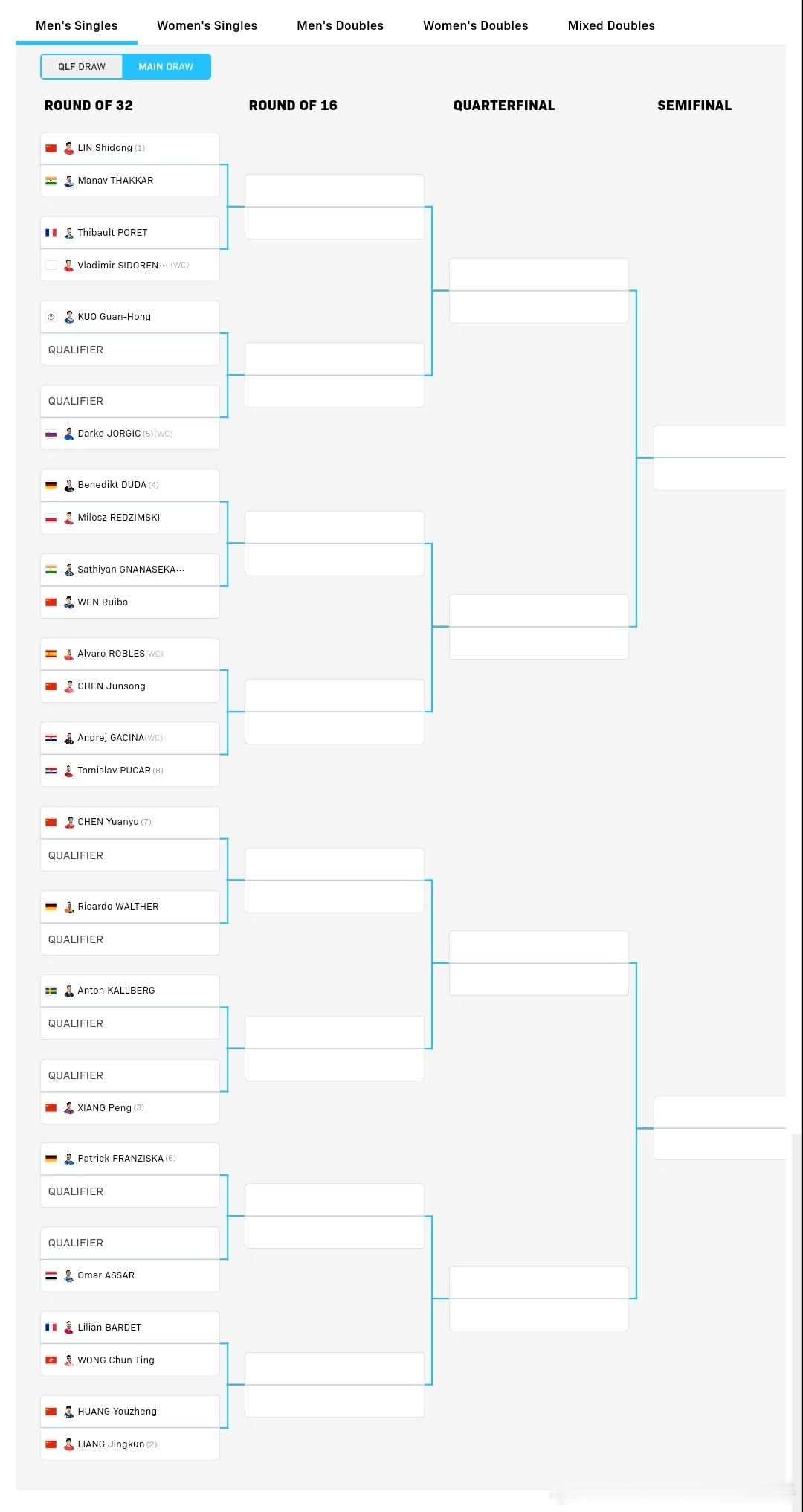 2026WTT马斯喀特常规挑战赛男单正赛签表:1/8区:林诗栋🇨🇳VS塔卡🇮🇳、泊雷特🇫🇷VS西多仁科🇷🇺(AIN)2/8区:郭冠宏(中国台北)VSQ、QVS达科🇸🇮3/8区:杜达🇩🇪VS雷德齐姆思基🇵🇱、加纳纳塞卡然🇮🇳VS温瑞博🇨🇳4/8区:罗伯勒斯🇪🇸VS陈俊菘🇨🇳、普卡🇭🇷VS加奇尼🇭🇷5/8区:陈垣宇🇨🇳VSQ、沃尔瑟🇩🇪VSQ6/8区:卡尔伯格🇸🇪VSQ、QVS向鹏🇨🇳7/8区:弗朗西斯卡🇩🇪VSQ、QVS奥马尔🇪🇬8/8区:力廉巴德🇫🇷VS黄镇廷🇭🇰、黄友政🇨🇳VS梁靖崑🇨🇳
