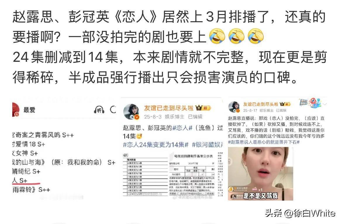 1月19日,赵露思《恋人》3月排播 片方想复刻《许我耀眼》的热度,也要看赵露思配不配合,我看悬,赵露思大概是内娱最不看好这部剧的人,赵露思去年直播提到这部剧就有点咬牙切齿,称没拍完硬播,他们赔钱是应该的,这部剧赵露思应该不会像《许我耀眼》一样卖力剧宣,不过彭冠英跟赵露思之前看路透cp感挺强的,说不准热播了也不一定,这就看剪辑师的功底了,没拍完的剧硬是剪成了一部完整剧! 赵露思