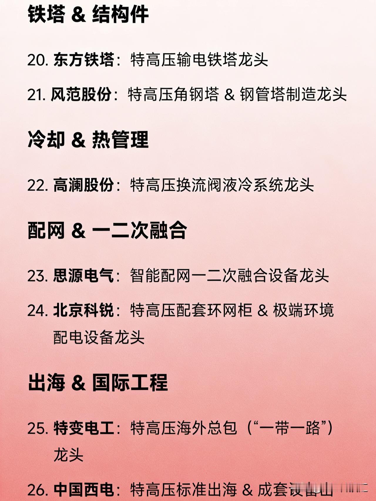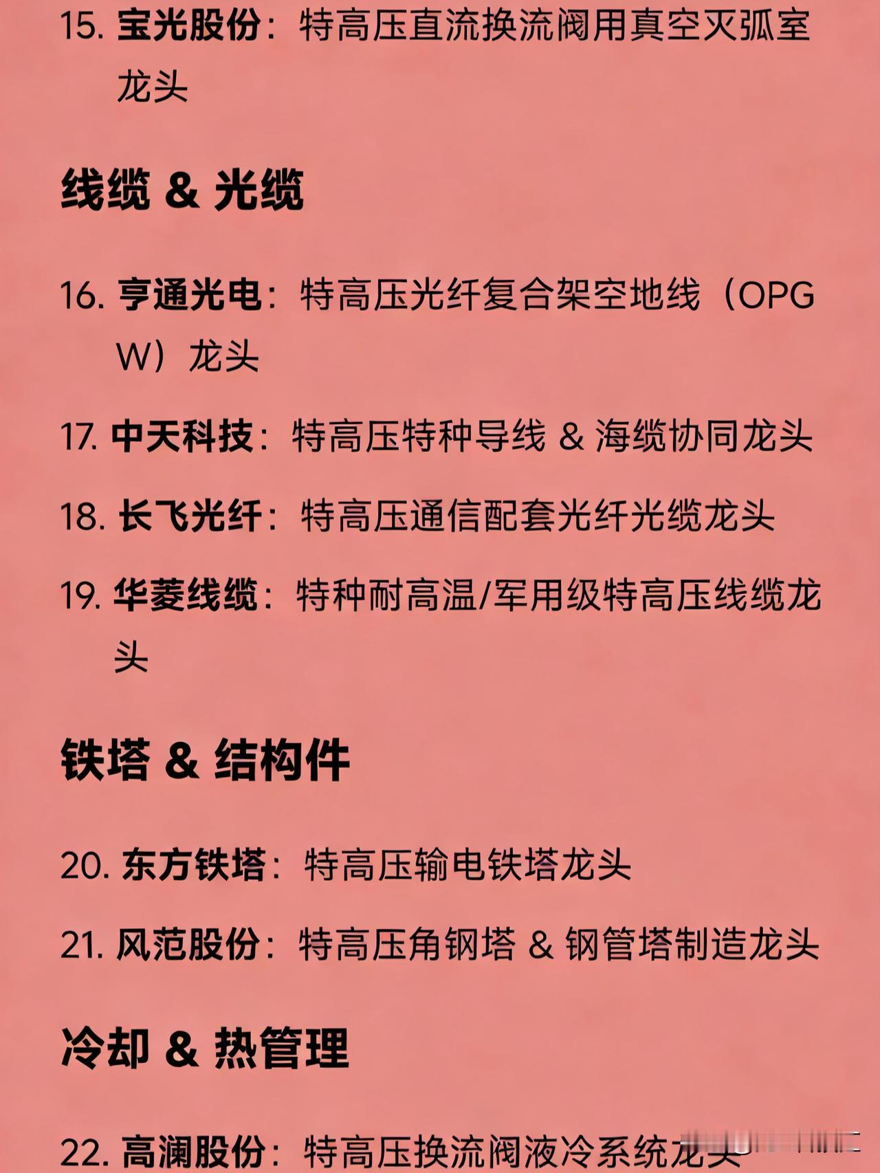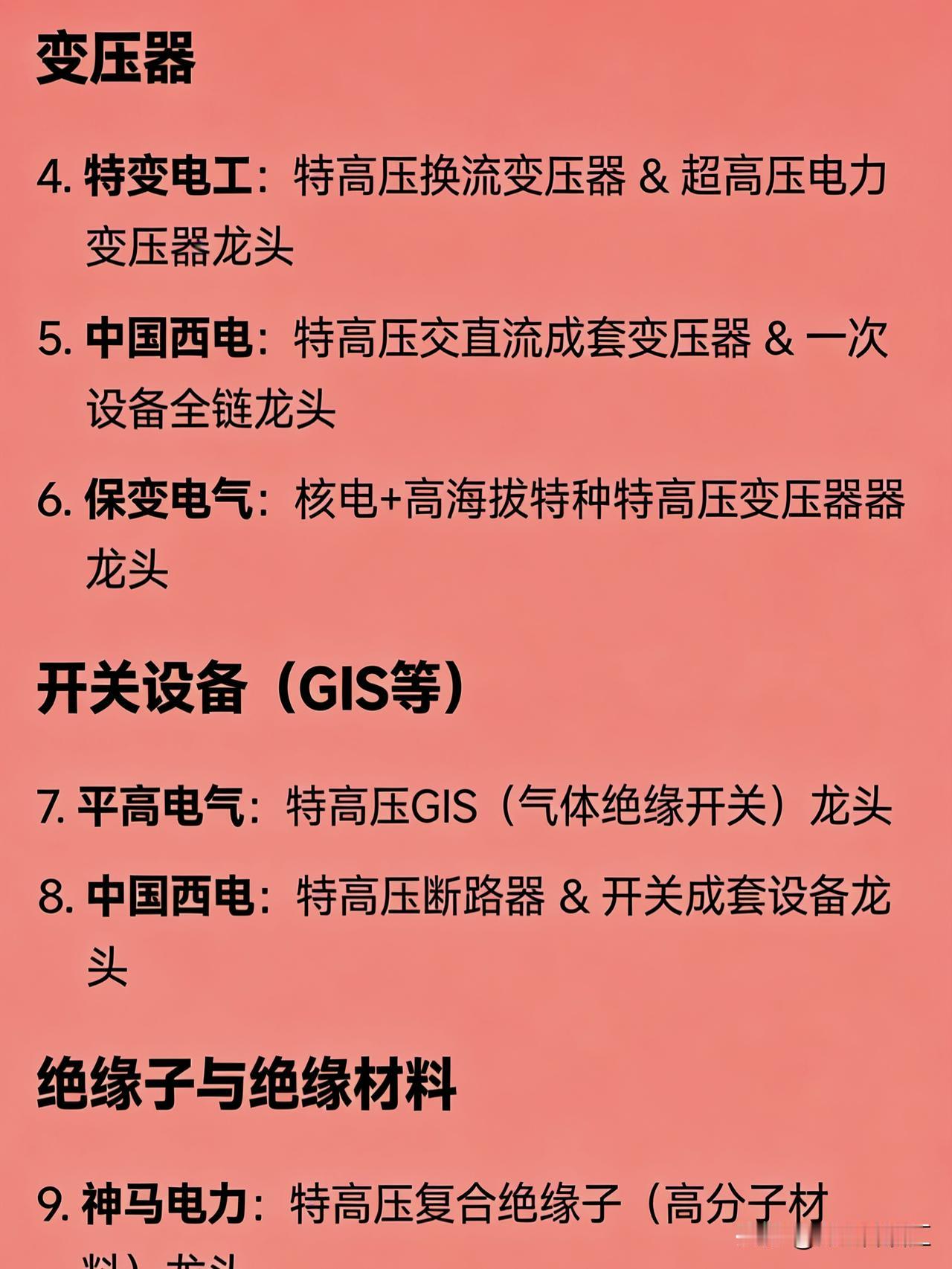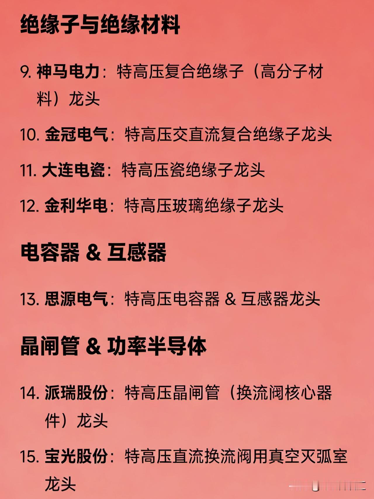 特高压概念核心龙头企业汇总 系统与控制保护 国电南瑞:特高压控制保护系统 & 电网自动化龙头 许继电气:特高压直流换流阀 & 柔性直流技术龙头 四方股份:特高压直流断路器 & 继电保护设备龙头 变压器 特变电工:特高压换流变压器 & 超高压电力变压器龙头 中国西电:特高压交直流成套变压器 & 一次设备全链龙头 保变电气:核电+高海拔特种特高压变压器龙头 开关设备(GIS等) 平高电气:特高压GIS(气体绝缘开关)龙头 中国西电:特高压断路器 & 开关成套设备龙头 绝缘子与绝缘材料 神马电力:特高压复合绝缘子(高分子材料)龙头 金冠电气:特高压交直流复合绝缘子龙头 大连电瓷:特高压瓷绝缘子龙头 金利华电:特高压玻璃绝缘子龙头 电容器 & 互感器 思源电气:特高压电容器 & 互感器龙头 晶闸管 & 功率半导体 派瑞股份:特高压晶闸管(换流阀核心器件)龙头 宝光股份:特高压直流换流阀用真空灭弧室龙头 线缆 & 光缆 亨通光电:特高压光纤复合架空地线(OPGW)龙头 中天科技:特高压特种导线 & 海缆协同龙头 长飞光纤:特高压通信配套光纤光缆龙头 华菱线缆:特种耐高温/军用级特高压线缆龙头 铁塔 & 结构件 东方铁塔:特高压输电铁塔龙头 风范股份:特高压角钢塔 & 钢管塔制造龙头 冷却 & 热管理 高澜股份:特高压换流阀液冷系统龙头 配网 & 一二次融合 思源电气:智能配网一二次融合设备龙头 北京科锐:特高压配套环网柜 & 极端环境配电设备龙头 出海 & 国际工程 特变电工:特高压海外总包(“一带一路”)龙头 中国西电:特高压标准出海 & 成套设备出口龙头 数字化 & AI调度 国电南瑞:AI电网调度 & 数字孪生电网平台龙头 柔性直流 & 新型输电 许继电气:±800kV柔直换流阀技术龙头 国电南瑞:柔性直流控制保护系统龙头 综合央企平台 中国电气装备集团(旗下含中国西电、平高、许继等):国家特高压“国家队”集成平台龙头