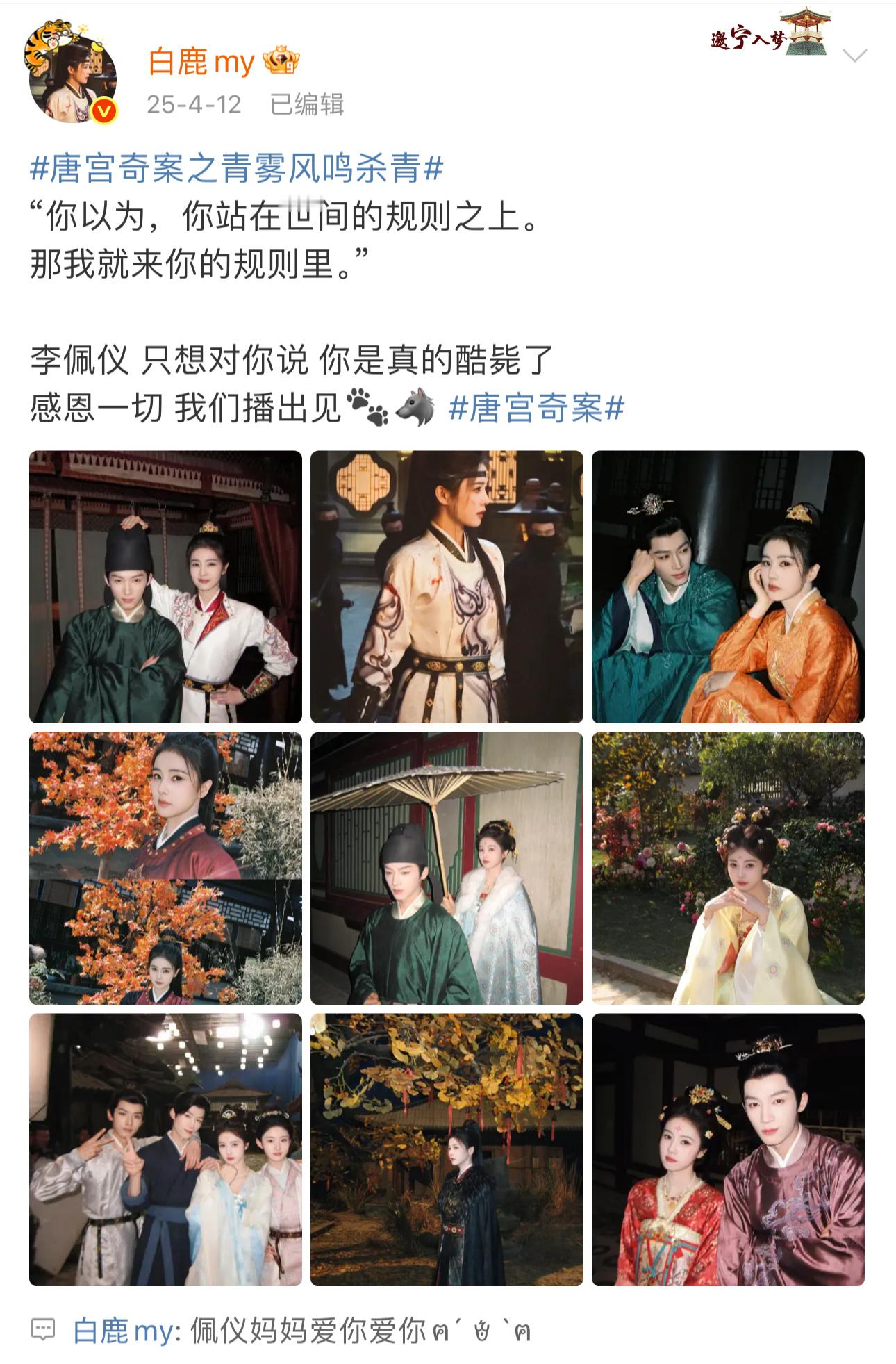凌晨听完了所有ost,还特意去杀青微博评论了评论了:“佩仪妈妈爱你爱你”,没有人比白鹿更爱李佩仪🥹🥹白鹿评论唐宫奇案杀青微博白鹿说佩仪妈妈爱你