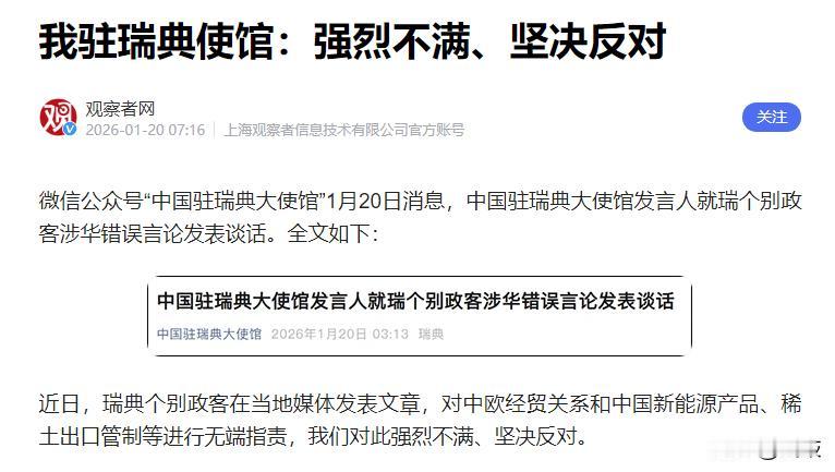 我驻瑞典使馆:强烈不满、坚决反对,中国驻瑞典大使馆发言人驳斥瑞典政客错误发言!