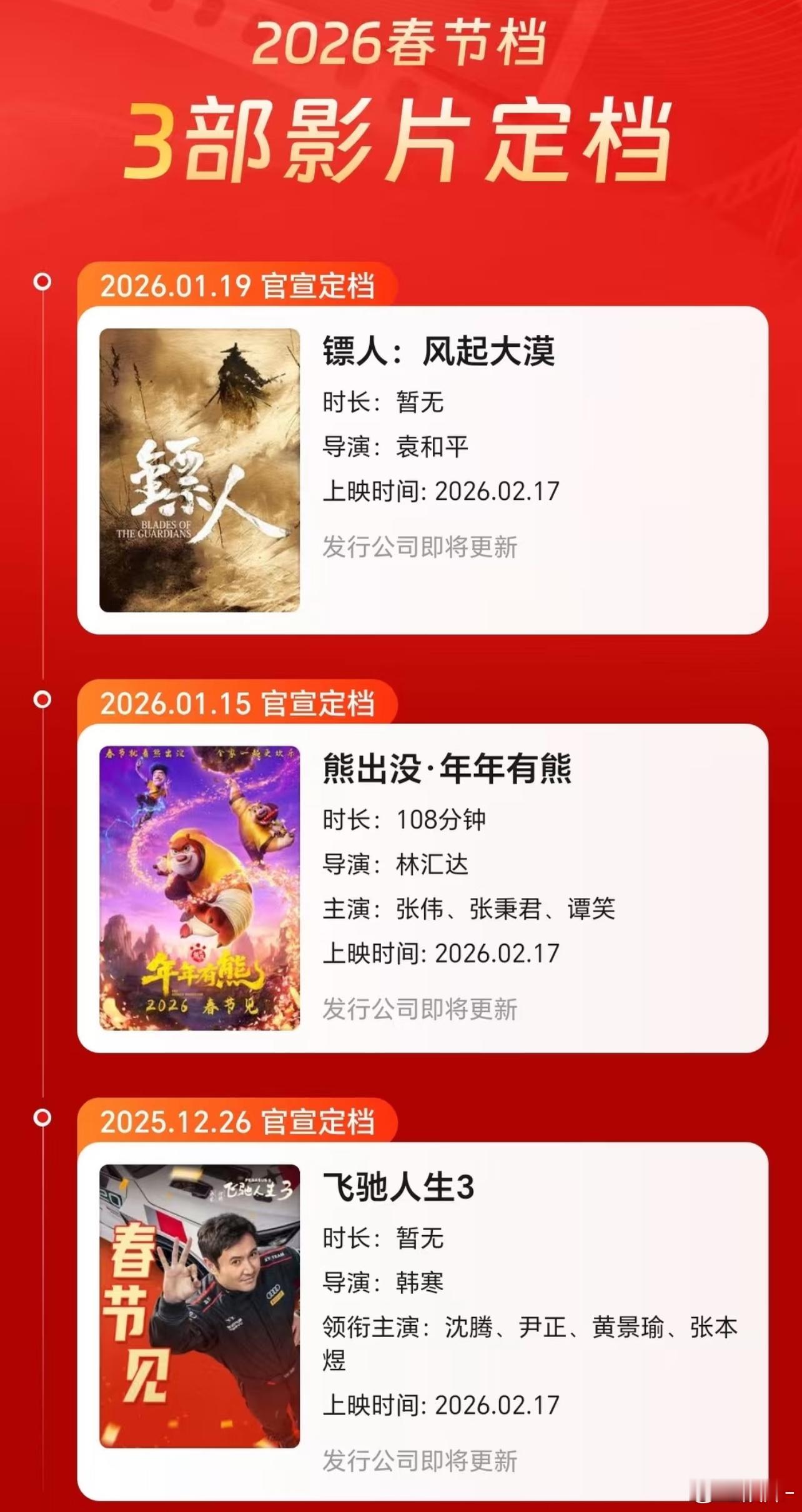 2026春节档3部电影定档,年年飞驰人生还有人期待吗?能不能来点新鲜的!