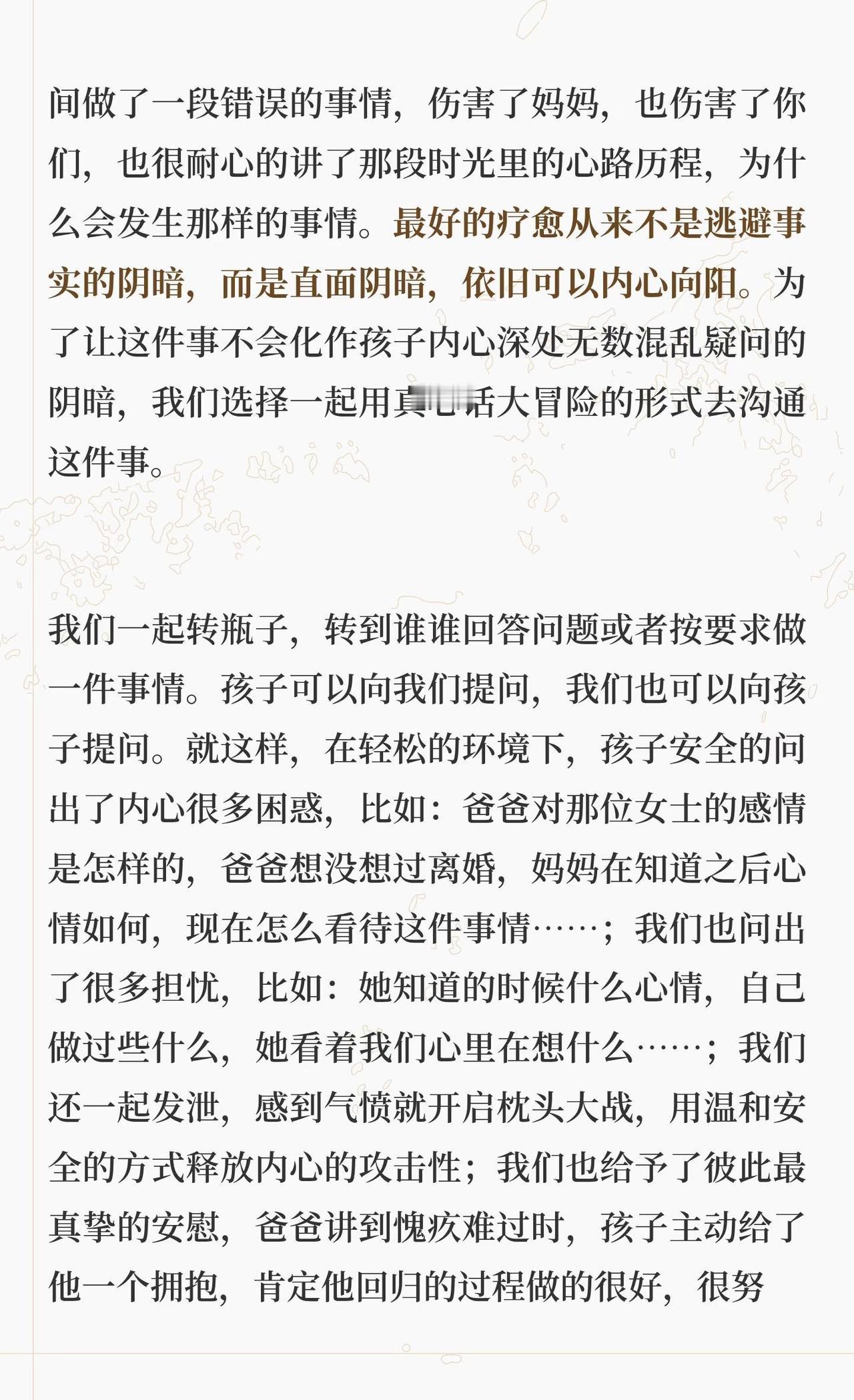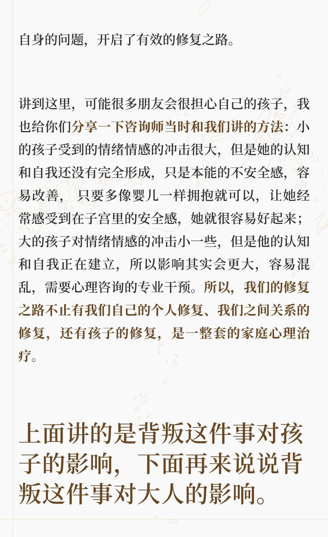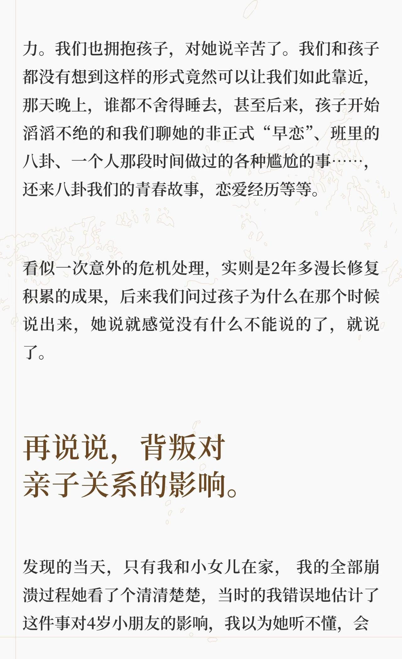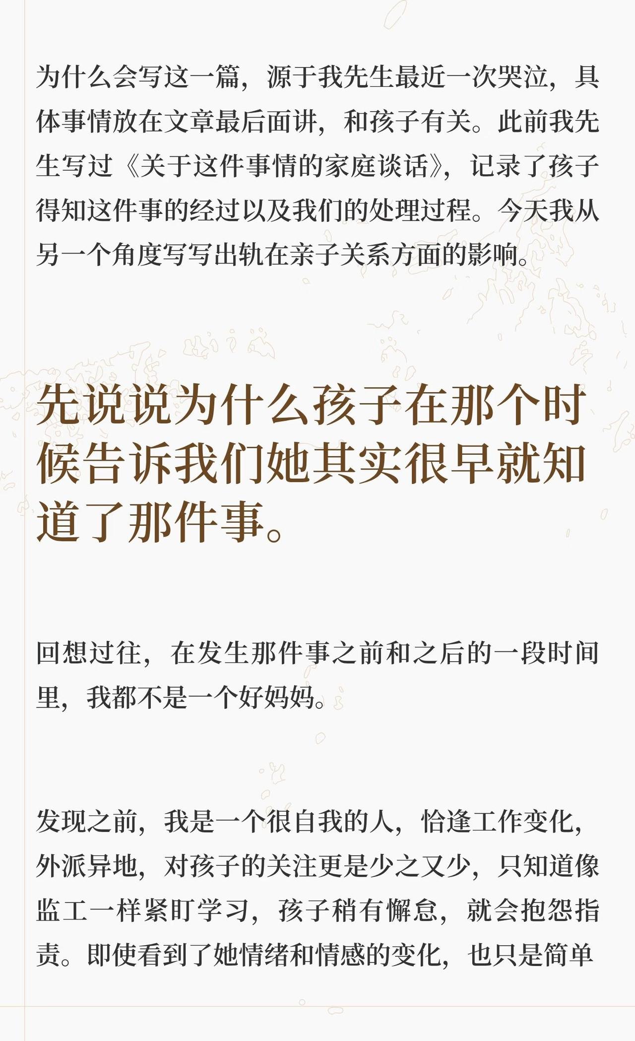 出轨对亲子关系的影响 为什么会写着一篇,源于我先生最近一次哭泣,具体事情放在文章最后面讲,和孩子有关。此前我先生写过《关于这件事情的家庭谈话》,记录了孩子得知这件事的经过以及我们的处理过程。今天我从另一个角度写写出轨在亲子关系方面的影响。 正文请看上面的图片。 婚姻修复 父母与孩子的信任关系 背叛出轨对孩子的的影响