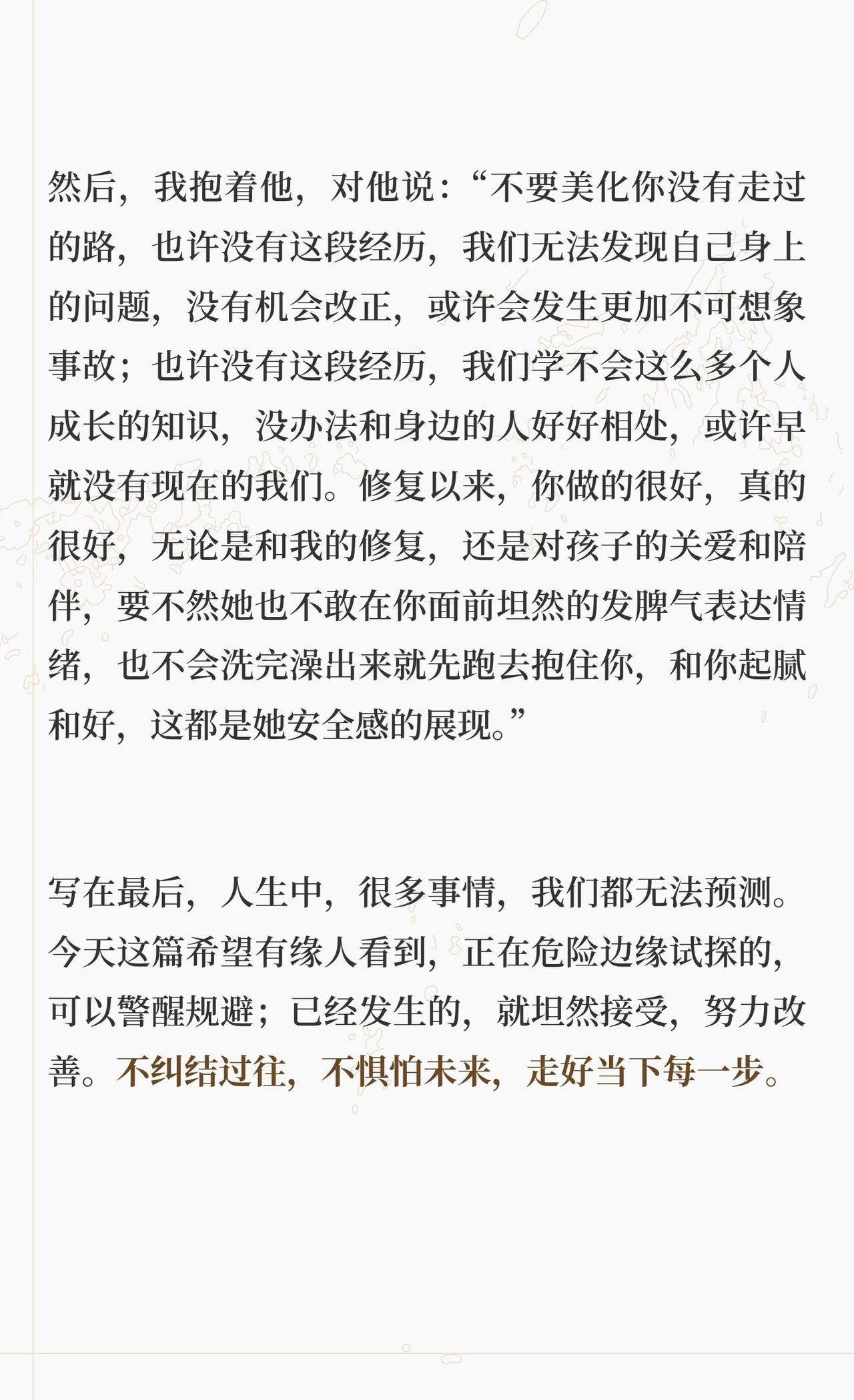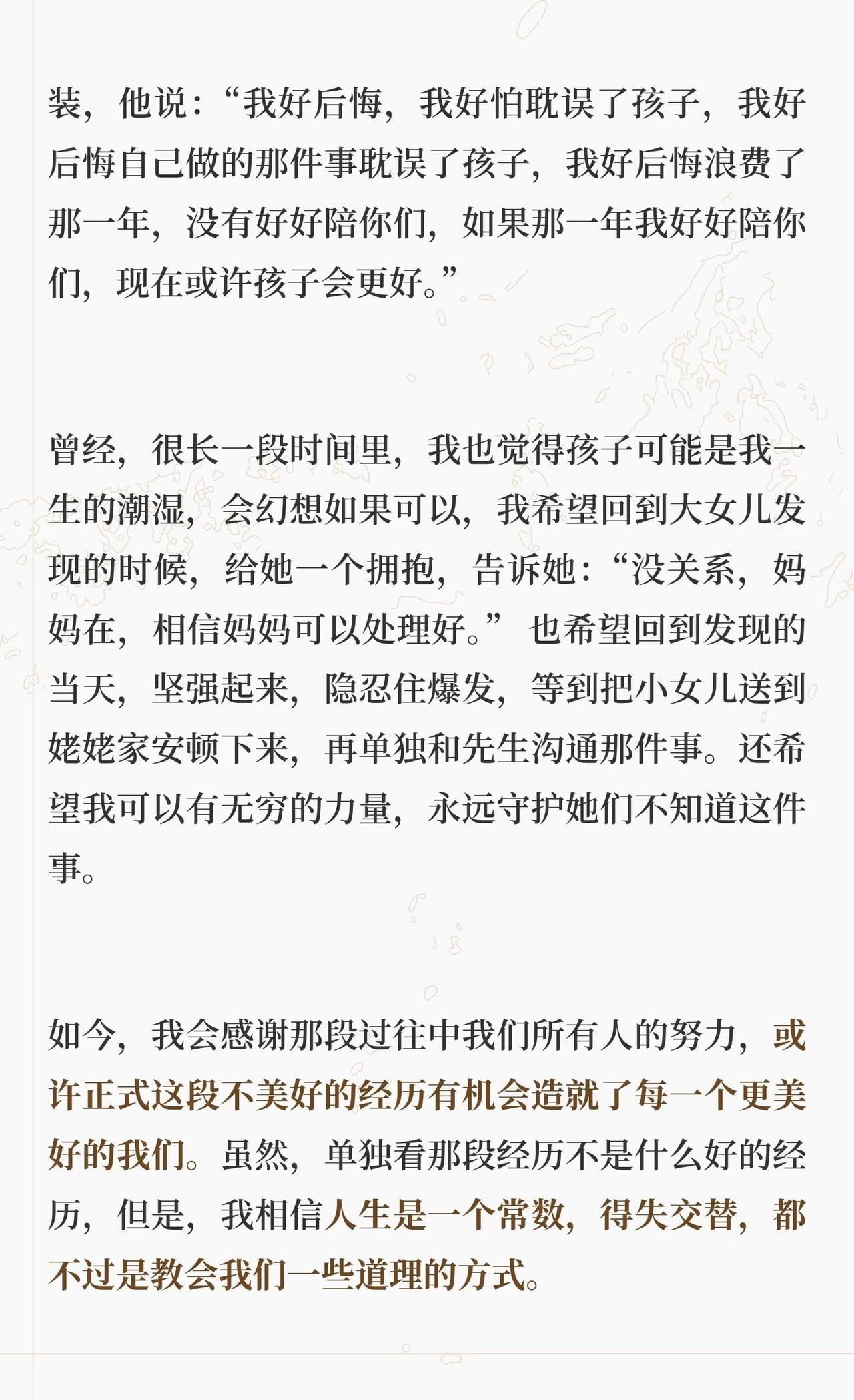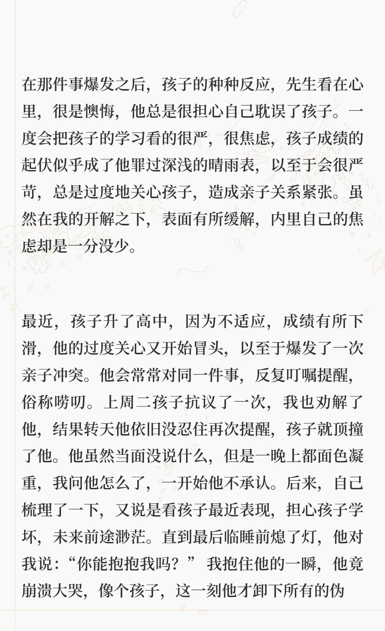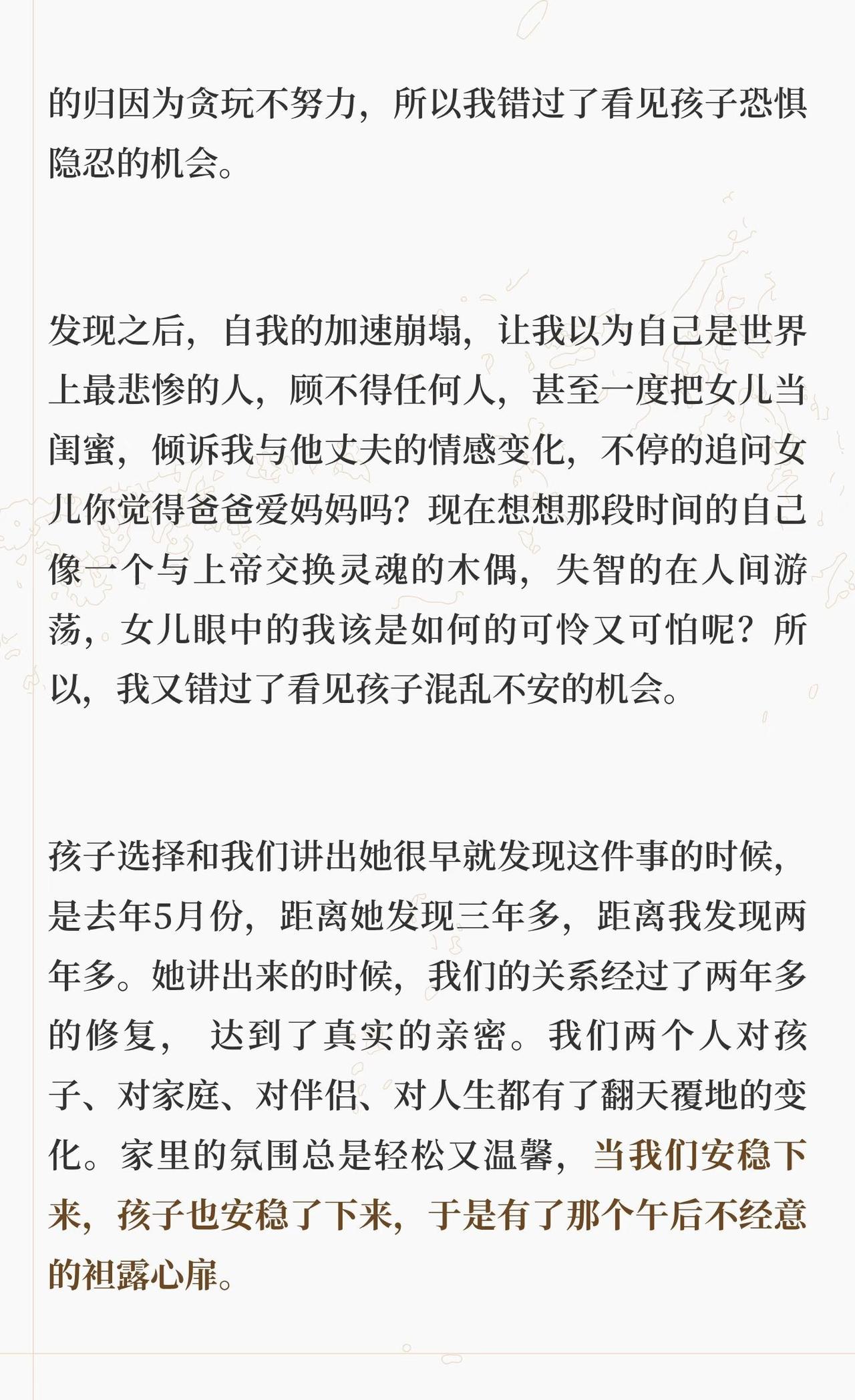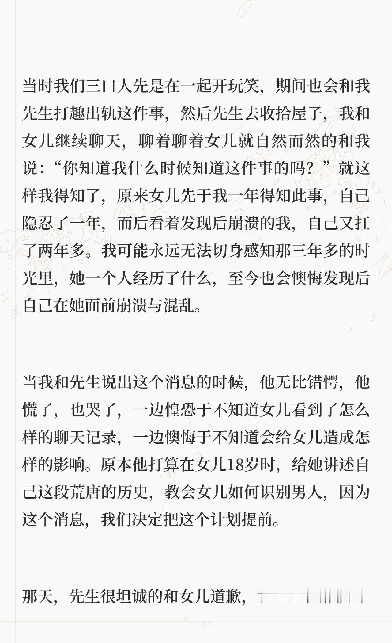 出轨对亲子关系的影响 为什么会写着一篇,源于我先生最近一次哭泣,具体事情放在文章最后面讲,和孩子有关。此前我先生写过《关于这件事情的家庭谈话》,记录了孩子得知这件事的经过以及我们的处理过程。今天我从另一个角度写写出轨在亲子关系方面的影响。 正文请看上面的图片。 婚姻修复 父母与孩子的信任关系 背叛出轨对孩子的的影响