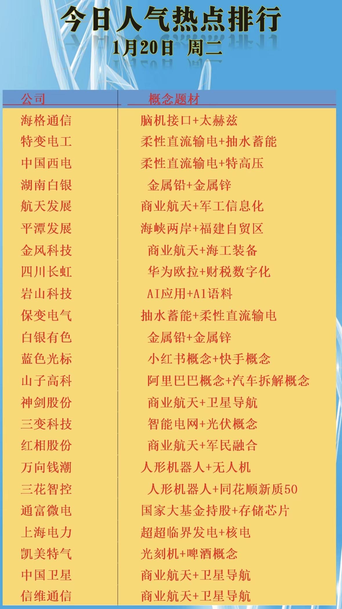 1月20日今日热点公司与概念题材全解析,助你把握市场脉搏!📈💡 "今日热点:脑机接口领涨,军工航天活跃,机器人概念升温,芯片电力受捧,金属与自贸题材齐飞。"