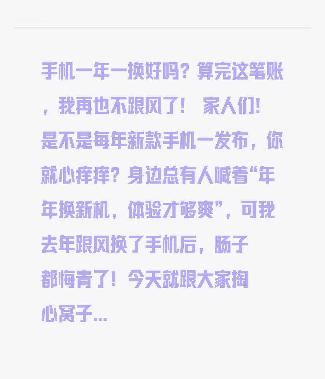 手机一年一换好吗?算完这笔账,我再也不跟风了! 家人们!是不是每年新款手机一发布,你就心痒痒?身边总有人喊着“年年换新机,体验才够爽”,可我去年跟风换了手机后,肠子都悔青了!今天就跟大家掏心窝子聊聊,手机一年一换到底值不值? 记得去年秋天,某品牌旗舰机刚发布,朋友圈里全是开箱视频。看着别人晒的高清摄像头、丝滑运行速度,再瞅瞅我手里用了两年的旧手机,越看越不顺眼。咬咬牙分期买了新款,拿到手的第一天,恨不得睡觉都揣着,拍照、玩游戏确实过瘾,可新鲜感也就维持了半个月。 等热度褪去,我才发现不对劲:旧手机明明还能流畅刷视频、聊微信、处理工作,除了电池续航差点,压根没到不能用的地步。更肉疼的是,新款手机用了不到一年,今年又出了升级版,我去年的“宝贝新机”,二手市场上价格直接腰斩,卖出去的钱连当初分期手续费都不够! 本以为一年一换是追求品质生活,直到我算了一笔账,才发现这就是个“消费陷阱”! 一台中端手机大概3000元,一年一换,三年就是9000元;而如果用三年再换,同样的预算能直接冲高端旗舰。更关键的是,现在手机更新换代,大多是挤牙膏式升级——摄像头像素高了一点、处理器性能提升了10%,这些提升对普通人来说,日常使用根本感知不到! 我表哥就是个反例,他的手机用了四年,只换过一次电池,花了不到两百块,照样用得顺风顺水。他总说:“手机就是个工具,够用就行,把钱省下来带老婆孩子旅游、给爸妈买礼物,不比换手机香?” 这话我以前听不进去,现在是彻底悟了。 仔细想想,我们跟风一年一换,真的是需要吗?不过是被商家的营销套路绑架,被身边人的攀比心理裹挟。新款手机确实香,但旧手机也没差到不能用;年年换新机确实有面子,但日子是过给自己的,舒不舒服只有自己知道。 其实啊,换手机没有绝对的“好”与“坏”,关键看需求。如果你是数码发烧友、靠手机工作的自媒体人,一年一换能提升效率,那没问题;但如果只是日常使用,真没必要跟风。把钱花在更有意义的地方,比拿着新款手机装面子,实在多了。 你们的手机用了多久?有没有跟风一年一换的经历?评论区聊聊你的故事!别忘了点赞收藏,让更多人跳出消费陷阱!