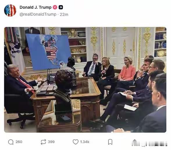 一群流氓头子开会,打算算怎么瓜分格陵兰岛,这个场景是不是似曾相识,当初捷克斯洛伐克的苏台德地区也是这样被德国拿走的。 当初老特(希特勒)想要捷克斯洛伐克的苏台德地区,捷克斯洛伐克不给,只好叫上英法两国进行调解,结果老特和英法两国头子商量完之后把苏台德给了老特,这次历史又上演了,只不过这次的主角换成了小特(特朗普)。
