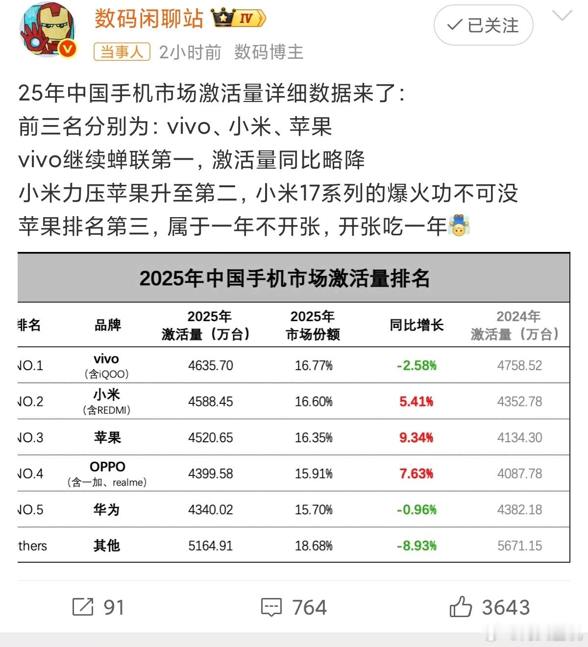 小米超苹果成中国手机激活量第二感觉国产手机竞争压力还是挺大的,看前五名差距都非常小,特别是vivo和小米,仅有50万的差距,但凡他们有哪一款手机卖爆,都能追回来,苹果还是一如既往的强大,其他手机厂商堆量都靠中低端机,唯独果子只卖高端机,利润贼高贼赚钱,华为也是依然那么猛,被制裁的情况下还能做到这个地步,甚至已经把荣耀挤下去了,也不得不佩服华子的实力。荣耀掉队之后也能看出他们在慌了,接连出了荣耀win系列和Air产线证明实力,一个一万毫安旗舰机,一个极致轻薄旗舰机,都是秀肌肉的产品,直接终结这两个赛道,2026年,手机市场的格局会变成什么样子呢?