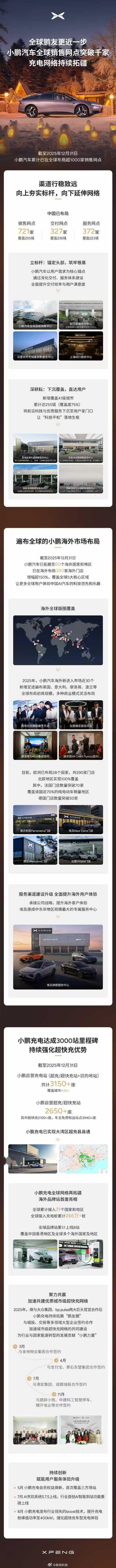 小鹏全球销售网点突破1000家小鹏自营充电站突破3000座建成 721 家销售网点、327 家交付网点、372 家服务网点,覆盖超250城,新增41个城市覆盖;海外已拓展至60国,年内新进入近30个市场,欧洲等核心区域门店布局提速并升级服务体系。充电网络同步拓疆,小鹏自营充电站(含超充 / 超快充)累计达3150+座,覆盖430+城,实现大湾区超充县县通;海外充电网络接入31国。