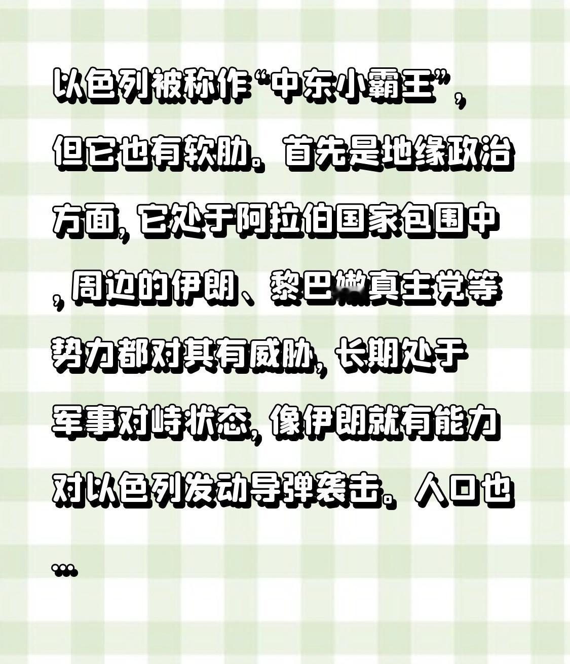 以色列被称作“中东小霸王”,但它也有软肋。首先是地缘政治方面,它处于阿拉伯国家包围中,周边的伊朗、黎巴嫩真主党等势力都对其有威胁,长期处于军事对峙状态,像伊朗就有能力对以色列发动导弹袭击。 人口也是一大问题,以色列人口总量有限,常备军规模受限,一旦战争规模扩大,兵源补充会有压力。而且以色列资源匮乏,石油等重要能源依赖进口,在战时很容易被掐住能源供应的脖子。这些软肋就像隐藏的定时炸弹,随时可能影响它在中东的地位。