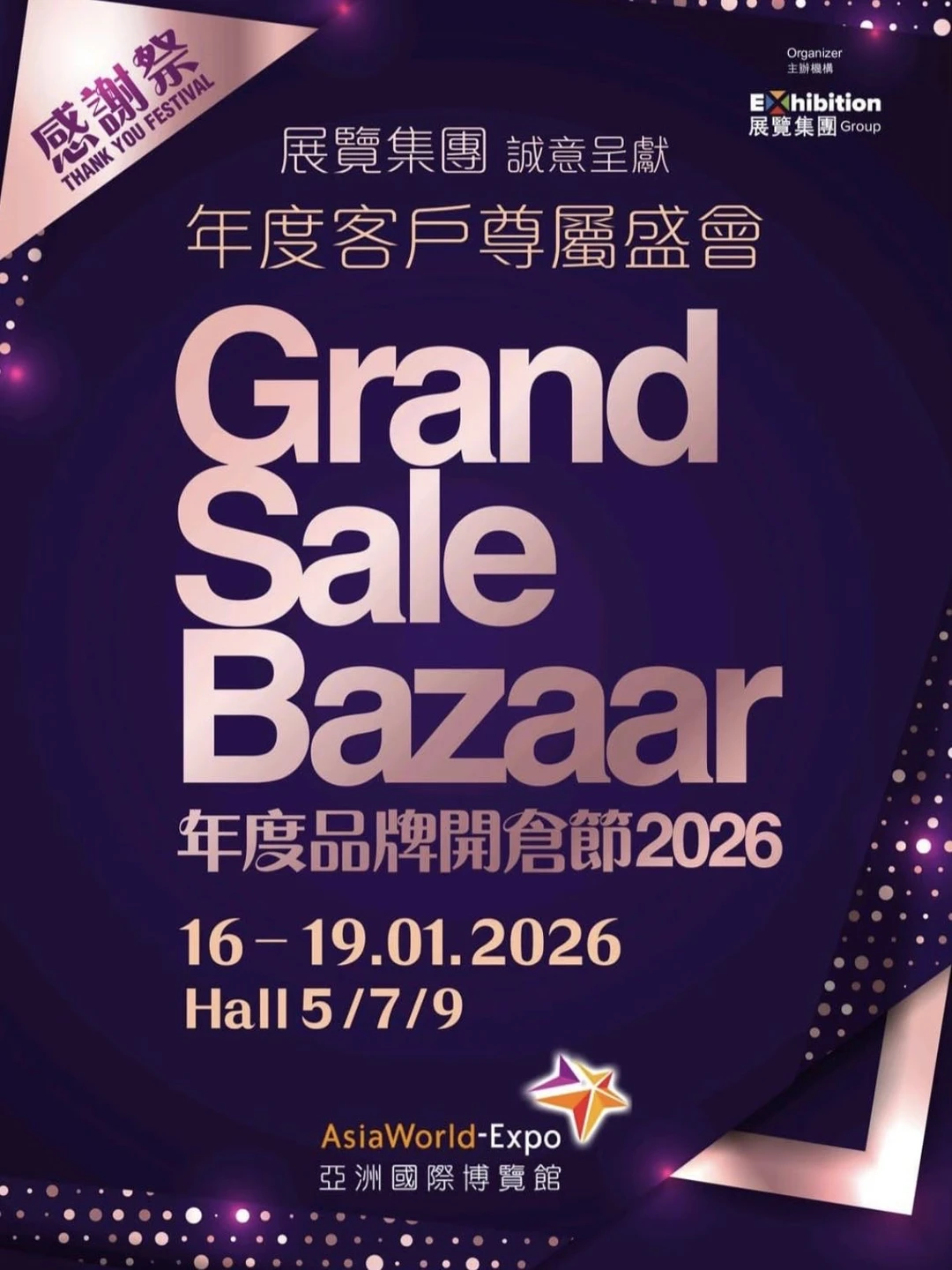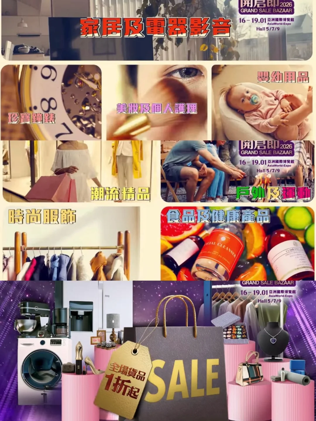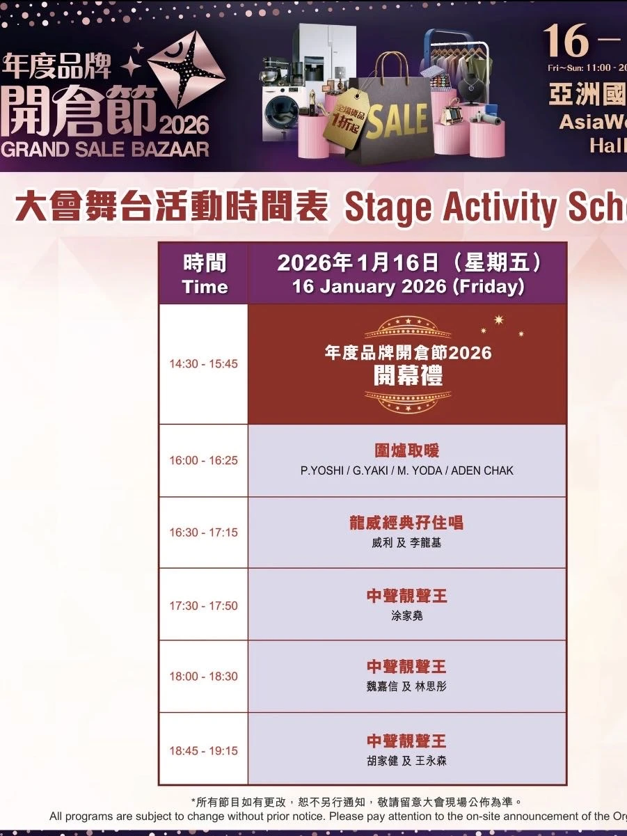就在香港!一年只得一次的机会,就在1月16至19日,在亚洲国际博览馆。今年展会,籍着新春之际,蕞低仅一扌斤起,让人期待! 今年展会超过400个展位,涵盖时尚服饰、美妆、家电等多个板块,总值1亿港元货品,蕞低仅一扌斤起,就在AWE Hall 5, 7, 9!! ✅年度品牌开仓节2026 ✅日期:2026年1月16 - 19日(五至一) ✅地点:亚洲国际博览馆 Hall 5,7,9 ✅时间:上午11时至晚上8时(最后一天至晚上5时) 涵盖八大主题开仓专区 时尚服饰、家居电器、潮流精品、美妆护理、健康食品、珠宝钟表、婴幼用品及户外运动等。 还有多个人气品牌摊位,这次都来到了展会现场。 记得预留好时间,提前过来扫货! ✨ I.T Mega冬日祭(展位号5-C19) 低至1扌斤,还有限定福袋。 ✨ DGG by LBuy 扭蛋Bazaar(展位号7-N51) 现场350部扭蛋机开仓,超200款扭蛋选择 ✨德国宝厨房设备有限公司(展位号7-J11) 多款1扌斤及半价优惠家电,大品牌信心保证 敲多种类的心仪用品,真的逛一天都逛不完! 还可以找我优先登记,获取免费门票,换完即止!朋友们记得dd我啦!