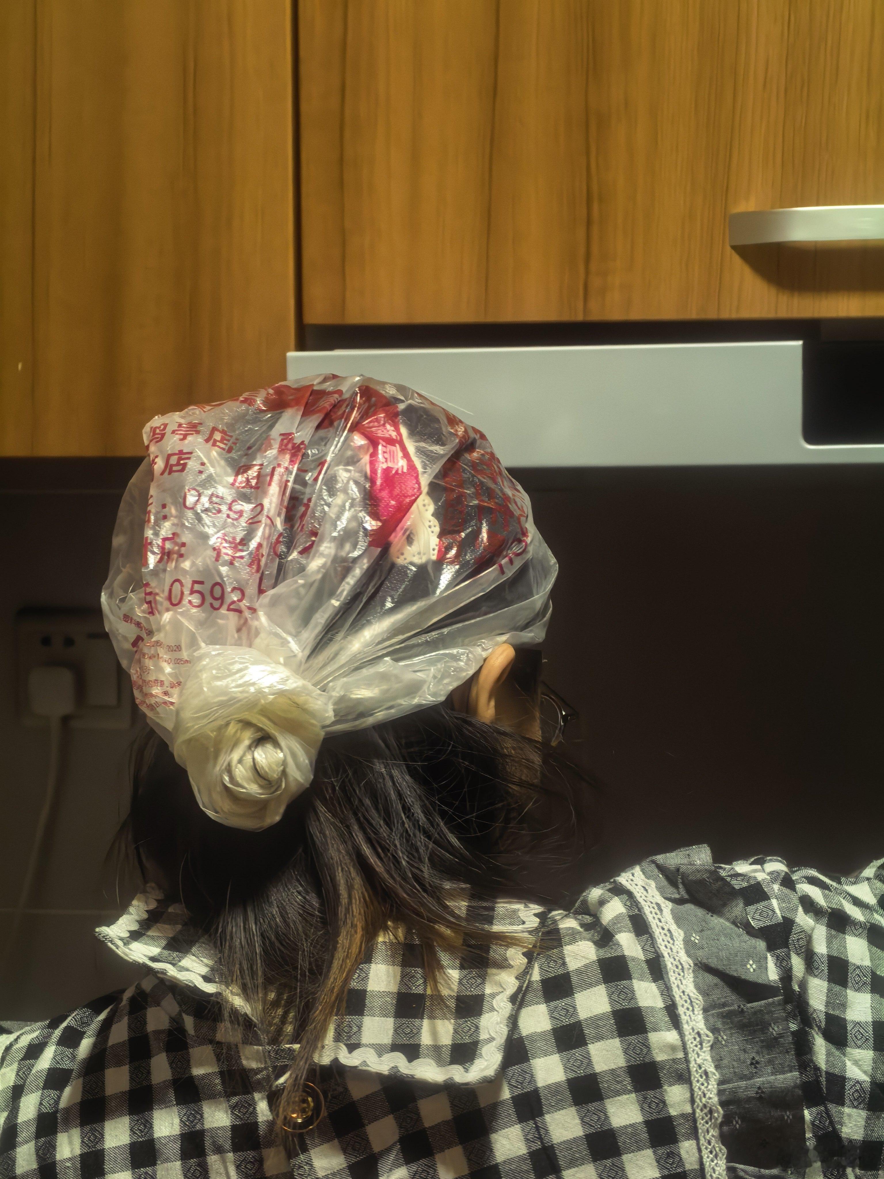 在小林妈妈家煮饭,找不到帽子了,但是发现个塑料袋~
