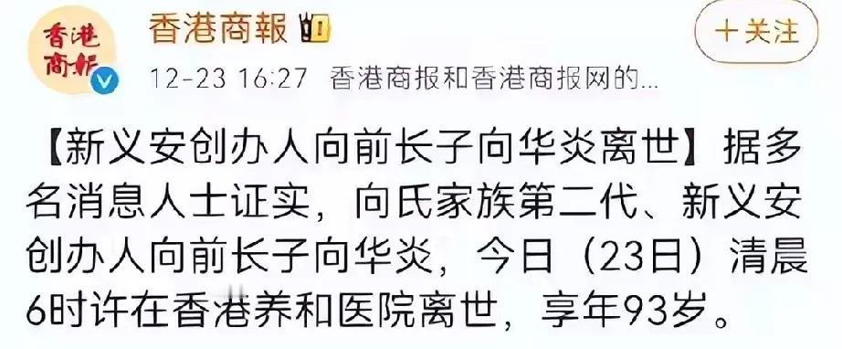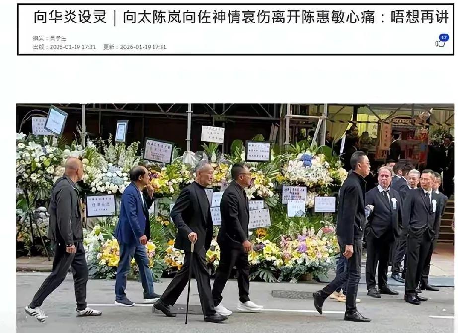 1月19日,向府治丧,场面浩大!“新义安”龙头向华炎离世,享年93岁,大批亲友前往吊唁,向华强戴孝,向太、向佐悲痛哀悼。 向华炎21岁临危受命,带领新义安转型合法生意,巅峰时生意覆盖多地,虽曾涉案但终获无罪释放。他一生跌宕起伏,口碑扎实。 葬礼现场,百余名警员戒备,还抓到在逃犯。向太曾多次表示,大哥向华炎是向家主心骨,为家族牺牲付出诸多。如今斯人已逝,唯愿一路走好! 免责声明:文章描述过程、图片都来源于网络,此文章旨在倡导社会正能量,无低俗等不良引导。如涉及版权或者人物侵权问题,请及时联系我们,我们将第一时间删除内容!如有事件存疑部分,联系后即刻删除或作出更改。 向华 向华平