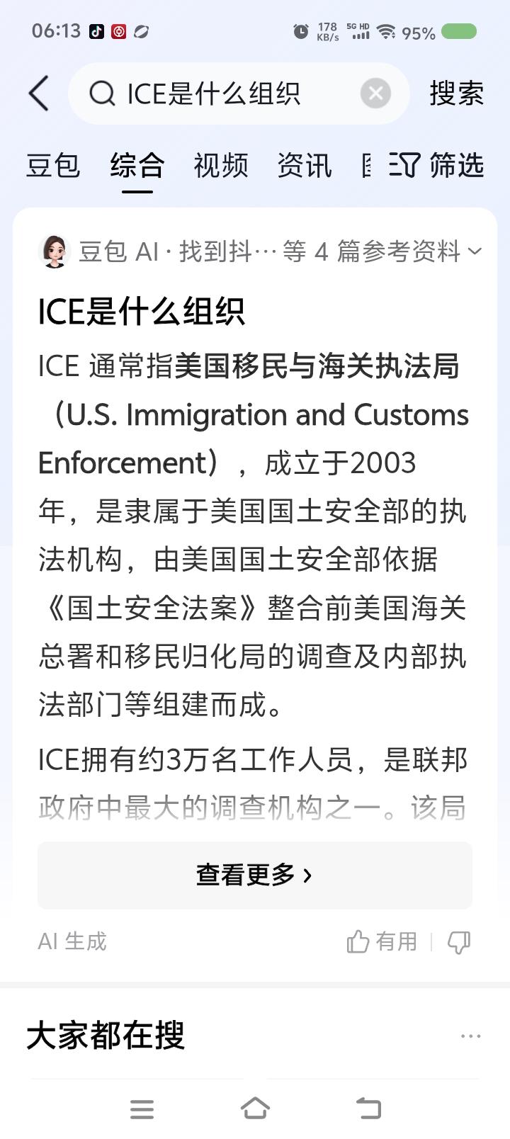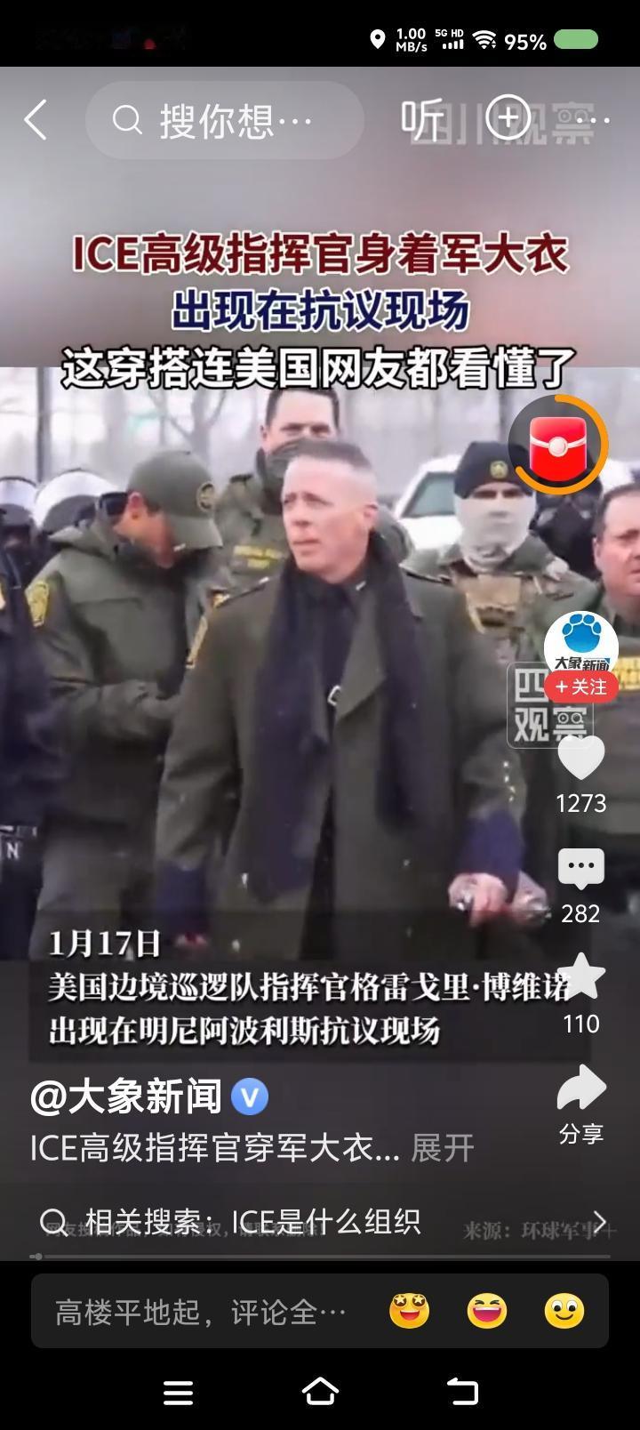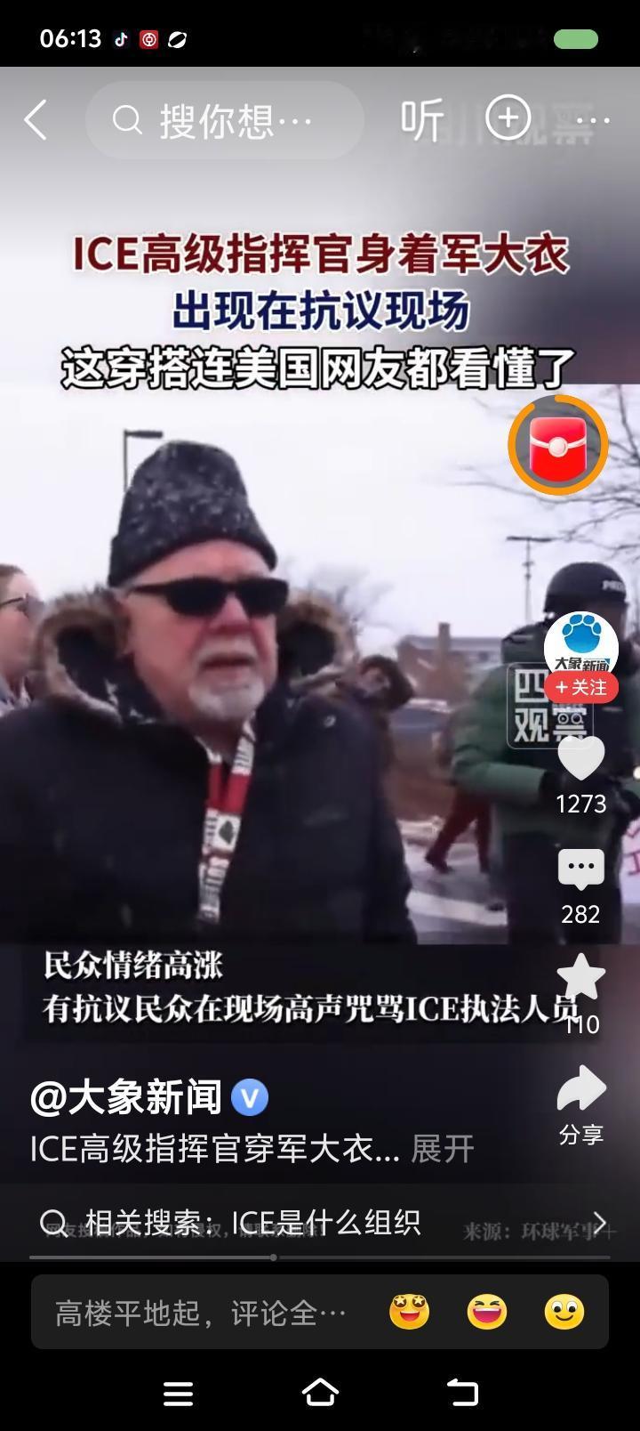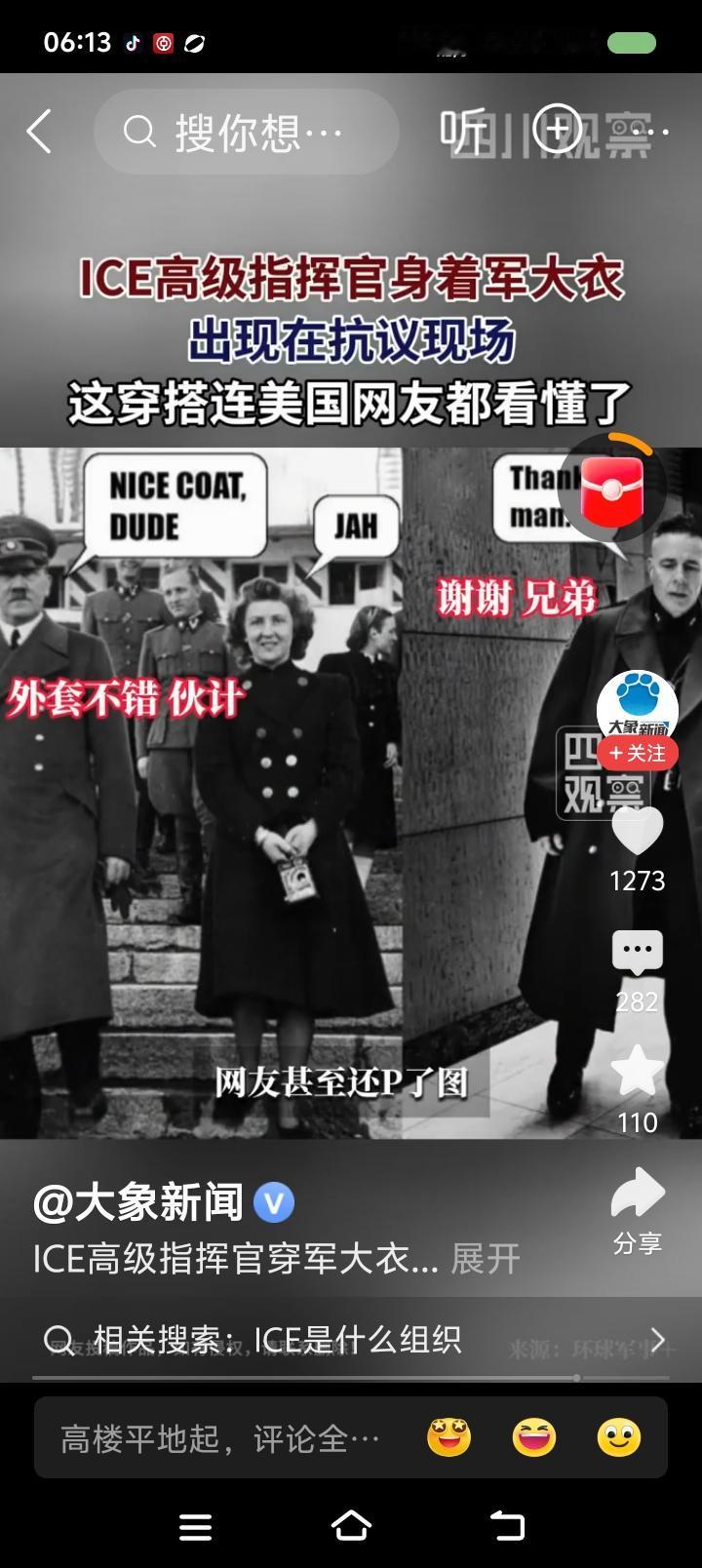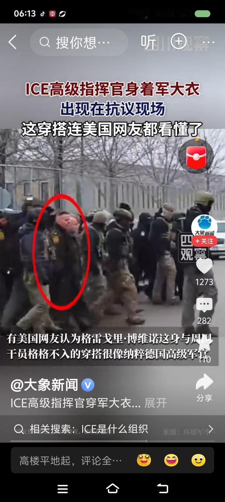 为什么中文新闻里老夹杂英文词?—— 据报道,美国ICE某高级指挥官出现在抗议群众现场,着军大衣,有美国网友认为这打扮像纳粹军官。 点评: 一、什么叫“ICE”?不就是“美国移民与海关执法局”么?翻译成“移民局”、“海关局”、“国土执法局”等不影响中国人的理解吧?建议尽量翻译,不要老出现中文夹英文单词的状况。 二、特朗普这是借打击非法移民的名义树立威权?谁不服就扣上这顶帽子?