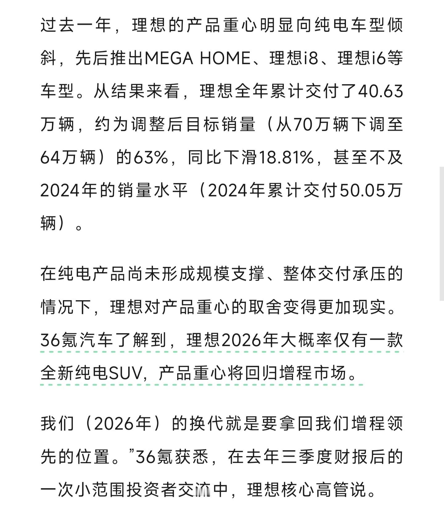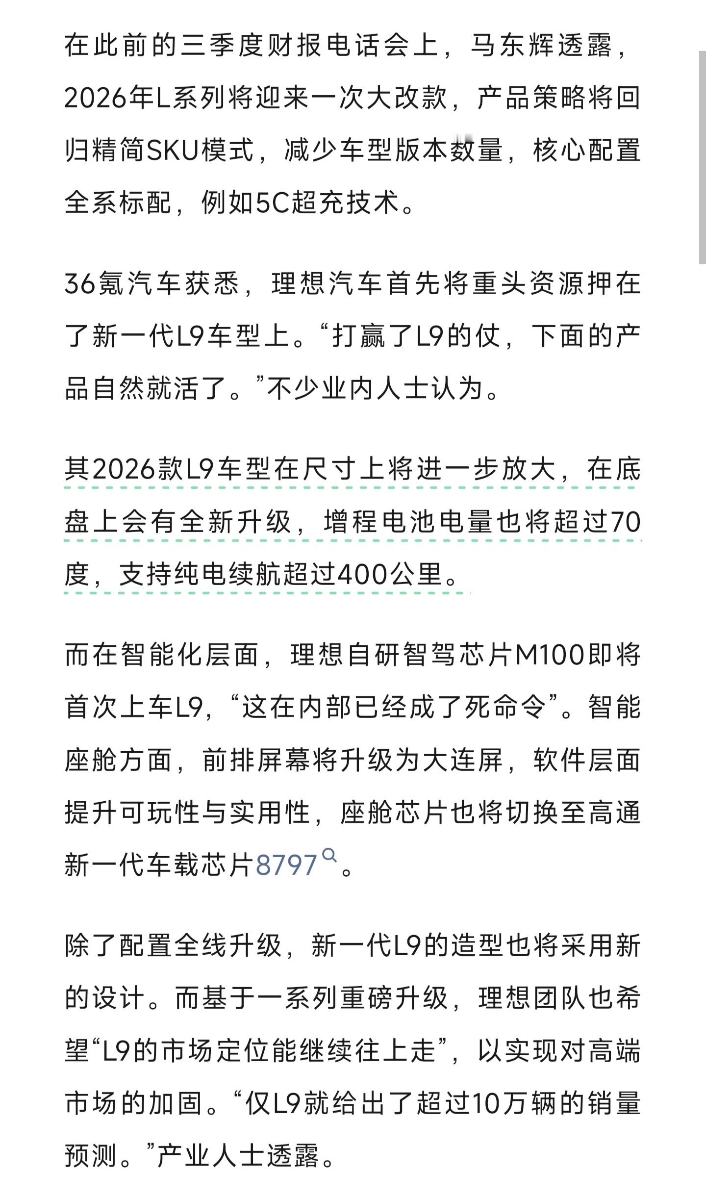 36氪汽车报道:理想为2026年初步制定了约40%的增长计划,对应55万销量。L系列大改款,L9尺寸增大、底盘全新升级,增程电池超过70度、纯电续航超过400公里。自研智驾芯片M100首次上车L9,前排升级为大联屏,座舱芯片更新到高通8797。理想希望L9的市场定位能继续往上走,年销量预测超过10万辆。理想2026年大概率仅有一款全新纯电SUV,产品重心回归增程市场,「拿回增程领先的位置」