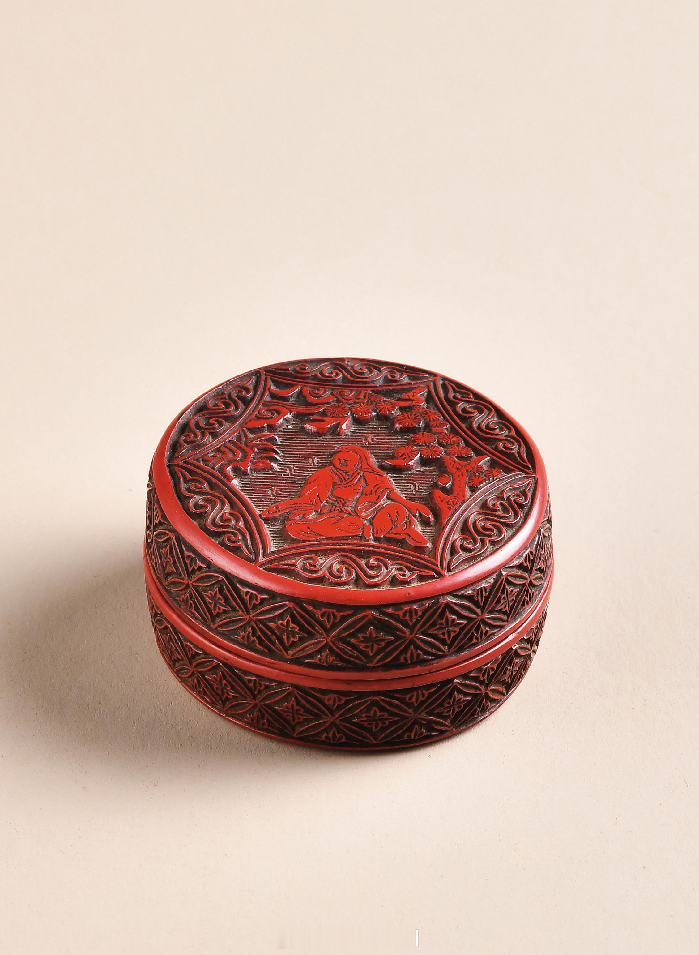 髹饰录 | 明 剔红松下高士图香盒香盒木胎,子母口,盒内髹褐漆,外壁剔红为饰。盒面六边形开光内饰松下高士图,天锦地,曲折回转,画面极富动态感,高士倚石游戏坐,神态安然自得,身着广袖长袍,袖摆随风扬起,自然生动,衣褶刻画简洁有力,这种“以线塑形”的技法、卷草纹中心开光的布局设计具有明显的唐代雕漆及刻版画之遗风。整体髹漆厚重,质地细腻,纹饰布局高雅,独具匠心,典雅不凡,确是一件不可多得的剔红之佳构。参阅:1.东京国立博物馆藏,南宋·堆朱凤凰花卉纹盒。2.根津美术馆藏,南宋·堆朱骑马人物图盘。尺寸:直径5.5cm;高3.2cm来源:北京博美2025年春季拍卖会《乾坤髹饰》 — 古代漆器专场