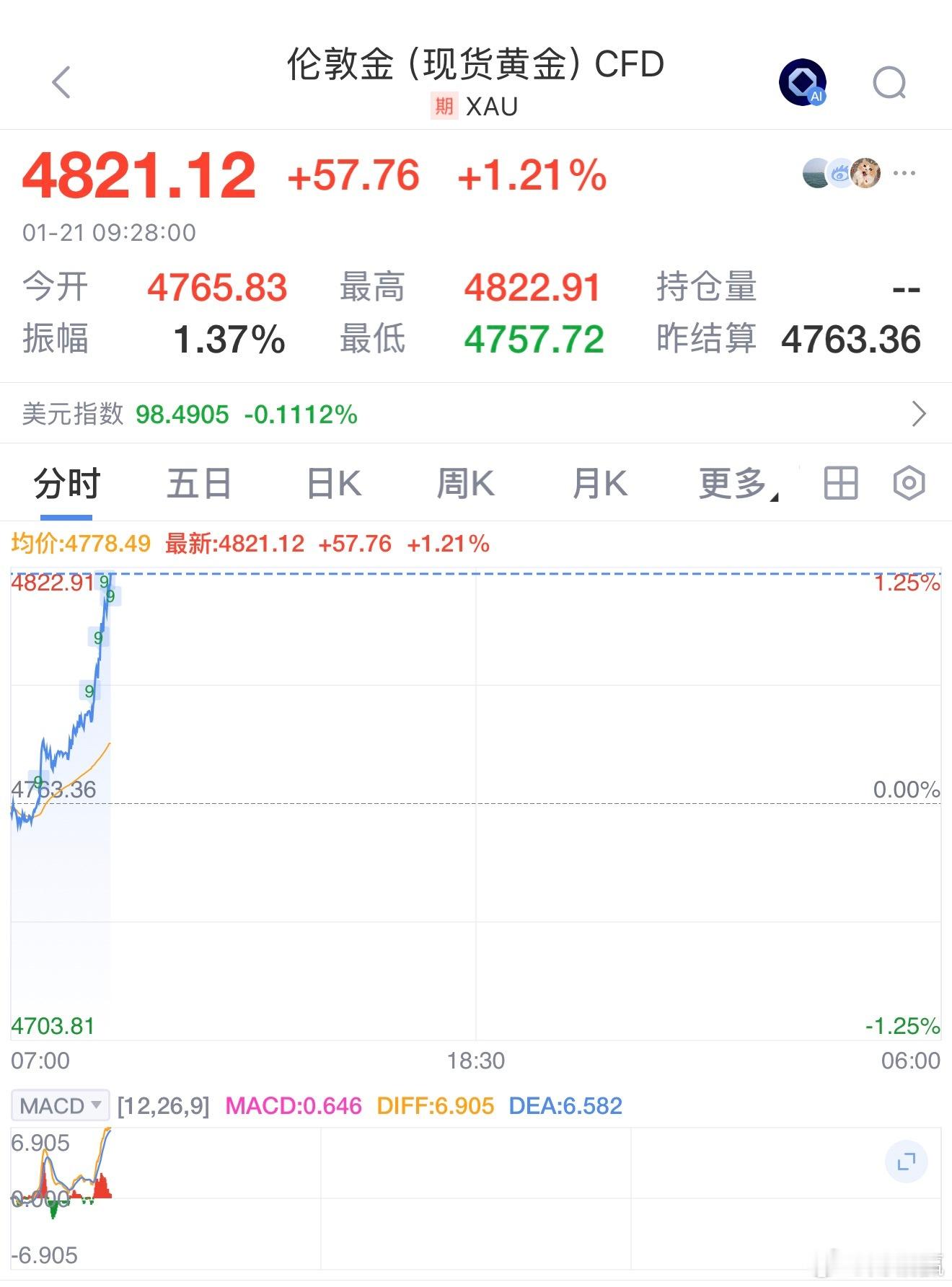 现货黄金站上4820美元/盎司,日内涨1.20%。金价