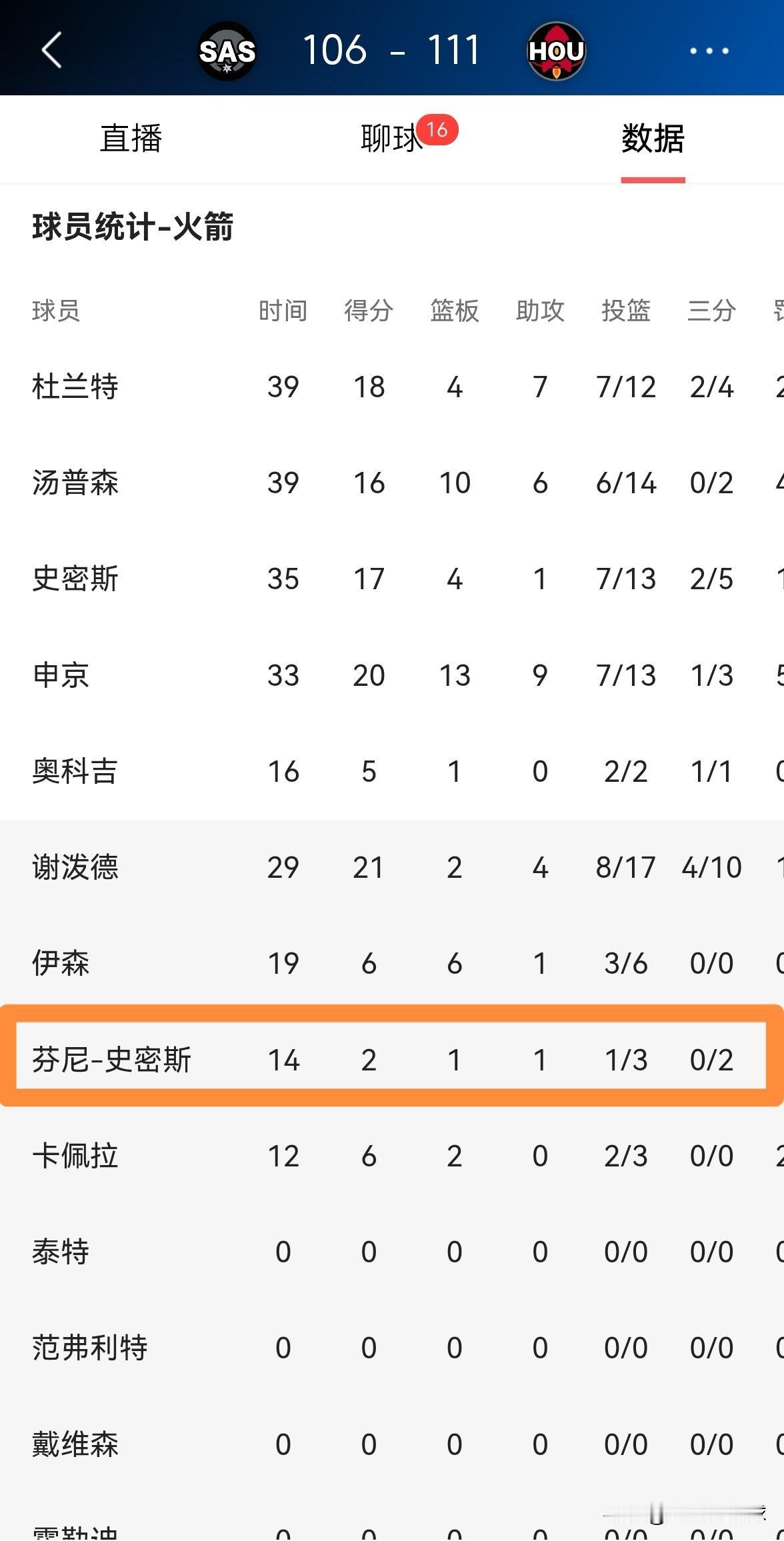 谁偷走了火箭大将芬尼-史密斯的投篮包?在今天火箭主场以111:106战胜马刺的比赛中,芬尼-史密斯又在三分线外失准,他在替补出战的14分钟里,投篮3中1,其中三分球2中0仅仅得到2分,他的场上正负值为+9。 众所周知,芬尼-史密斯上赛季效力湖人时期投出了四成以上的三分球命中率,然而在转投火箭以后,他却把自己的三分球投篮包弄丢了。