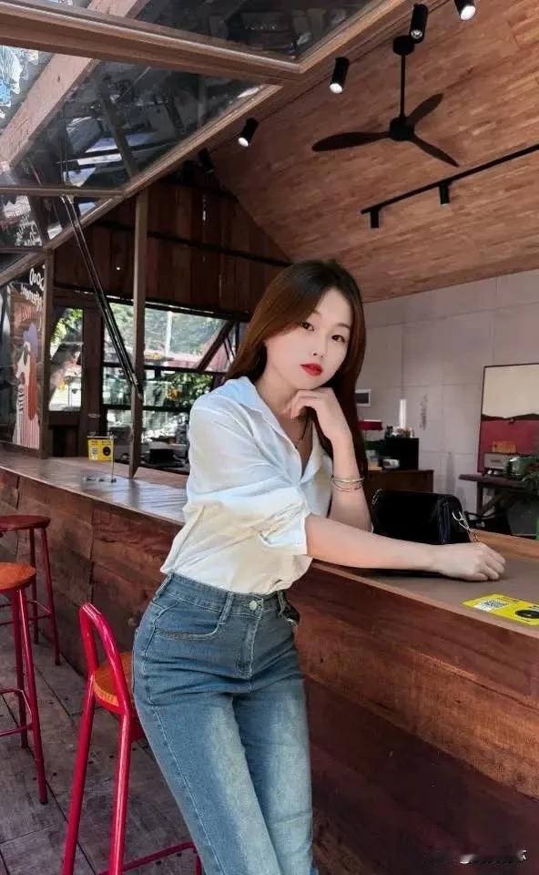 阳光洒进咖啡馆,少女倚靠吧台,静享悠闲时光。