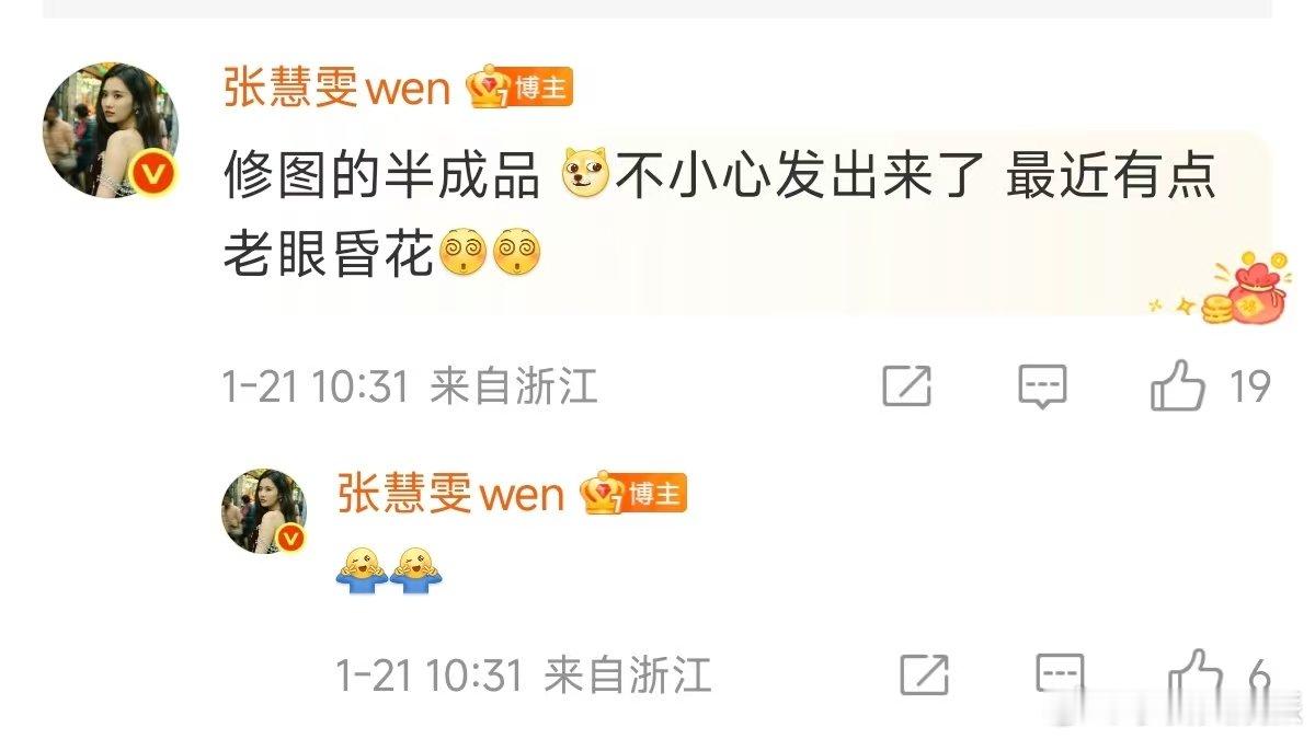 张慧雯修图半成品不小心发出来了玉茗茶骨收官张慧雯刚发完《玉茗茶骨》的收官图,就笑着说自己手滑把修图半成品发出来了,还自嘲“老眼昏花”,可爱又接地气,谁能不爱这样的迷糊美女!