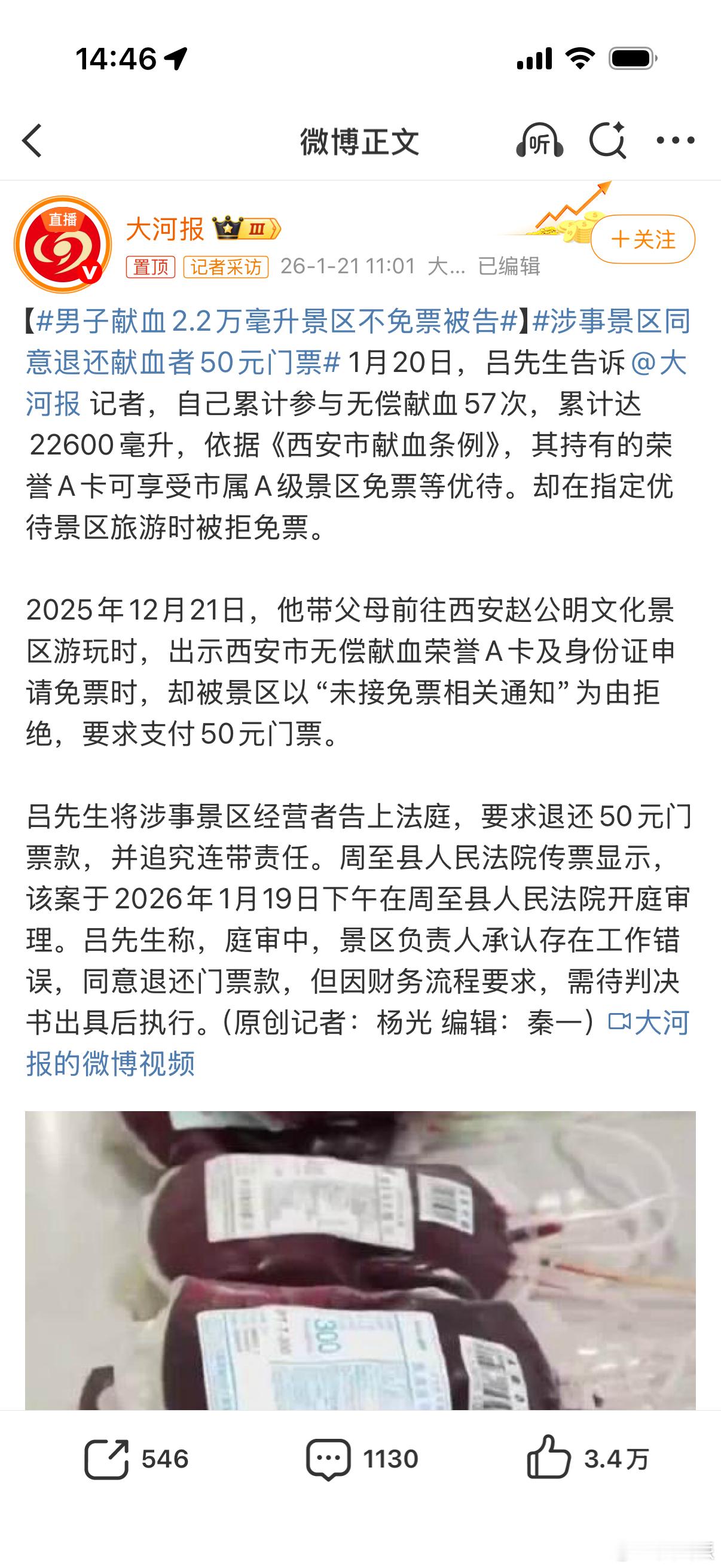 男子献血2.2万毫升景区不免票被告其实现实中还有很多这种的案例,上面的政策和下面的相关单位对其颗粒度,最后让人寒心。但必须为这个人点赞,50元我不是出不起,是看不惯你们的嘴脸