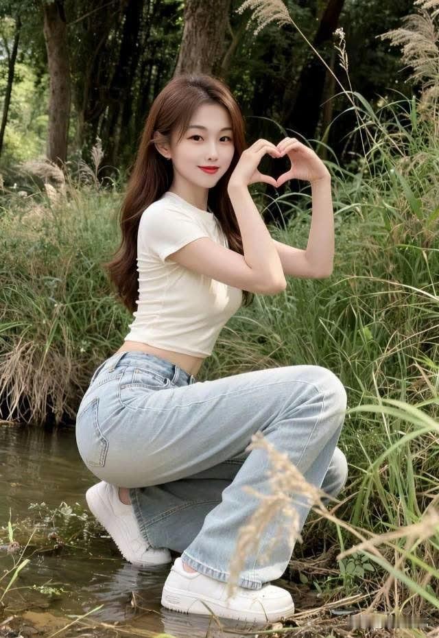 在森林里,她用双手比出爱心,微笑着蹲在水边,自然又甜美。