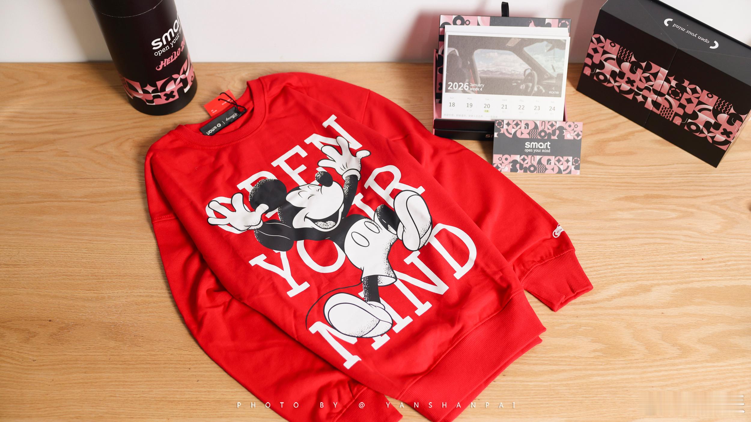 收到了Smart寄来的礼盒,里面除了一份26年日历外,还有一件红色的米老鼠衣服,