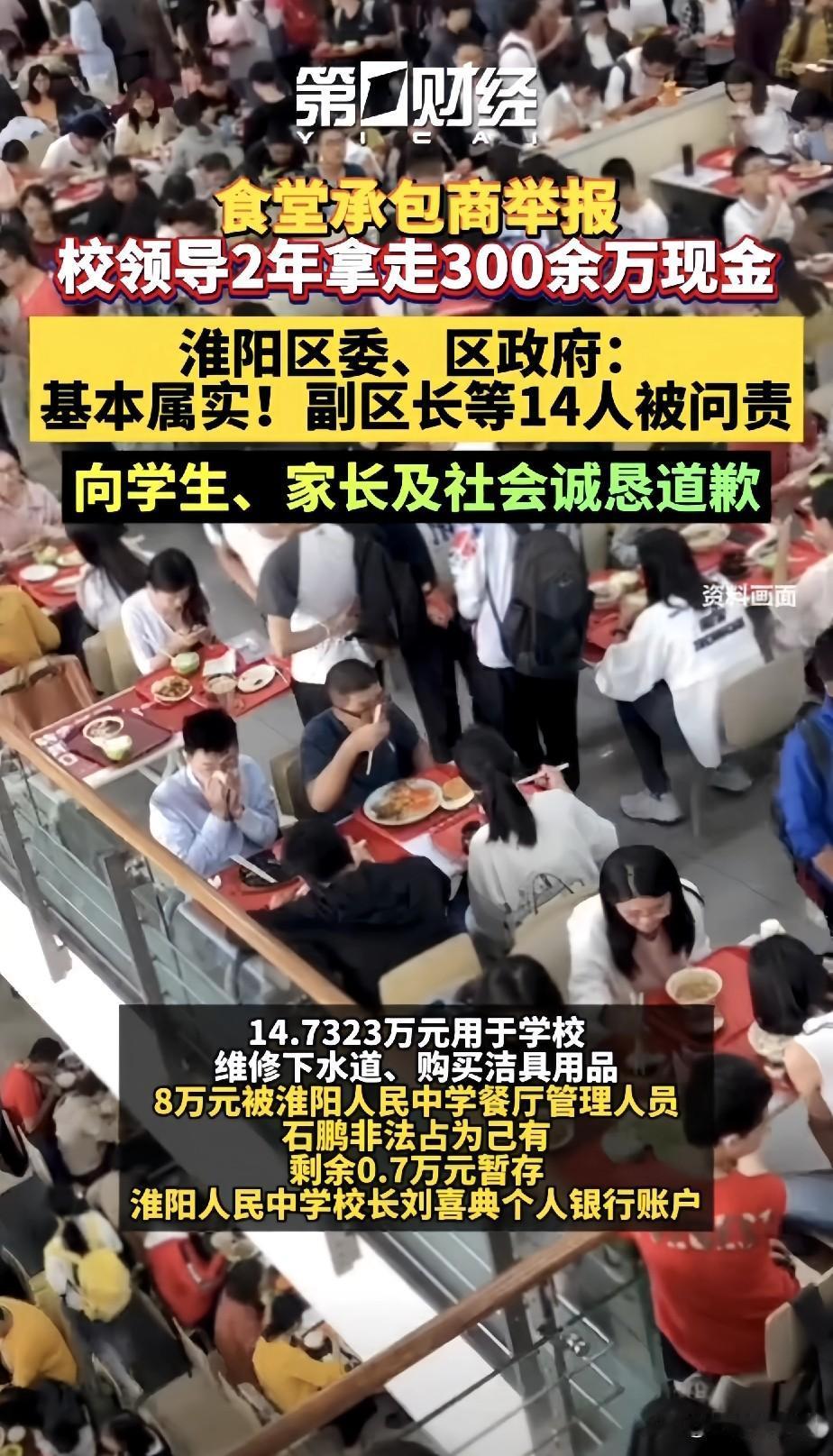 家人们谁懂啊!淮阳人民中学这410万餐费贪腐案,根本不是简单的违规收费——是校领导盯着3000个住校生的饭碗,每天硬抠3块钱,足足薅了两年的“吸血操作”! 本来跟食堂老板说好的,就收4.5%的管理费,结果校领导直接翻脸,撂下狠话:“不交15%就滚蛋!”老板之前为了承包食堂,砸了不少钱装修,只能哑巴吃黄连认栽。更黑的是,学校逼着老板用现金返点,还不让走公账转账,就是怕留下证据! 这410万多的巨款,分6次交!每次都是老板从银行取出现金,要么直接塞给后勤主任石鹏,要么当场转到他指定的私人账户。你瞅瞅这操作,不是心里有鬼是啥? 钱的去向更离谱!别光看数字,细节才扎心: - 387万拿去给老师发补课费了,合着拿孩子的伙食费,填教师福利的窟窿? ​ - 14万就够修修下水道、买个清洁用品,食堂里那些老旧设备,愣是一分钱没舍得换; ​ - 8万被石鹏直接揣进自己腰包,现在已经被移送检察院,等着蹲大牢吧; ​ - 最可笑的是剩下那0.7万零头,居然还存进了校长刘喜典的个人账户! 更讽刺的是啥?学校一边喊着“食堂必须公益”的口号,一边开着党总支会议,光明正大地商量怎么抽成!把“集体决策”当成挡箭牌,真是把脸都丢尽了! 现在好了,14个责任人全被处理,副区长、教体局局长一个没跑,410万也得一分不少退给学生。可我就想问一句:这两年里,学校那3000多个住校生,每天20块的餐标被抠掉3块,孩子们吃的到底是啥? 是清汤寡水的素菜,还是缺斤少两的肉菜?这笔账没人算,但每个当家长的,心里都跟明镜似的! 👉 评论区聊聊:你觉得该咋彻底杜绝学校从孩子饭碗里抠钱的事?