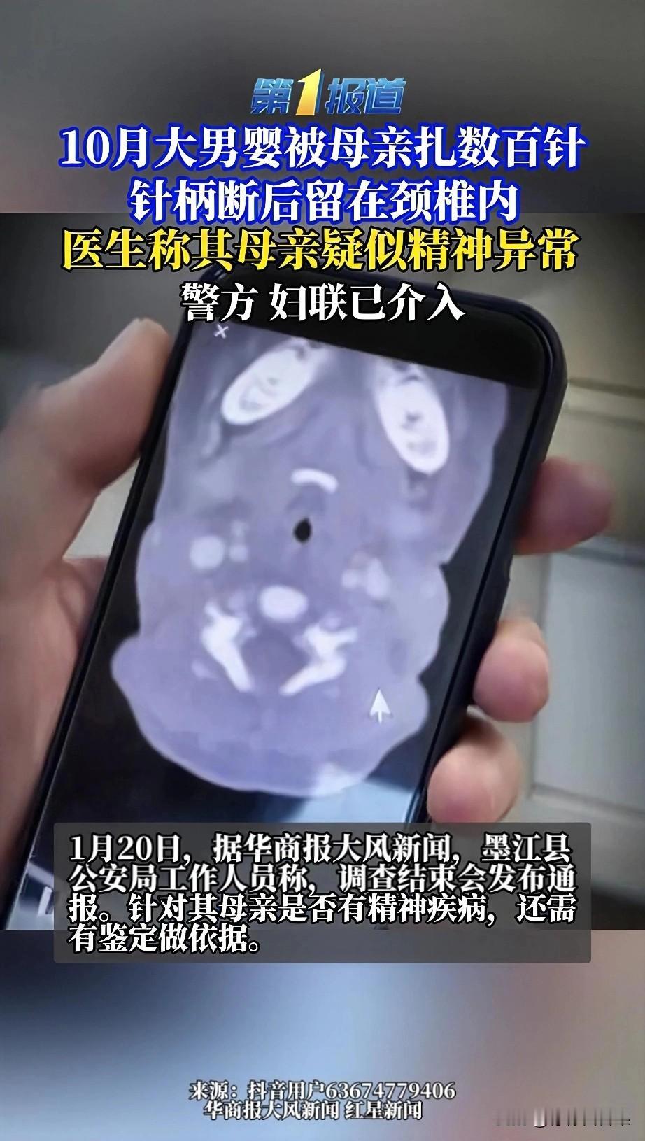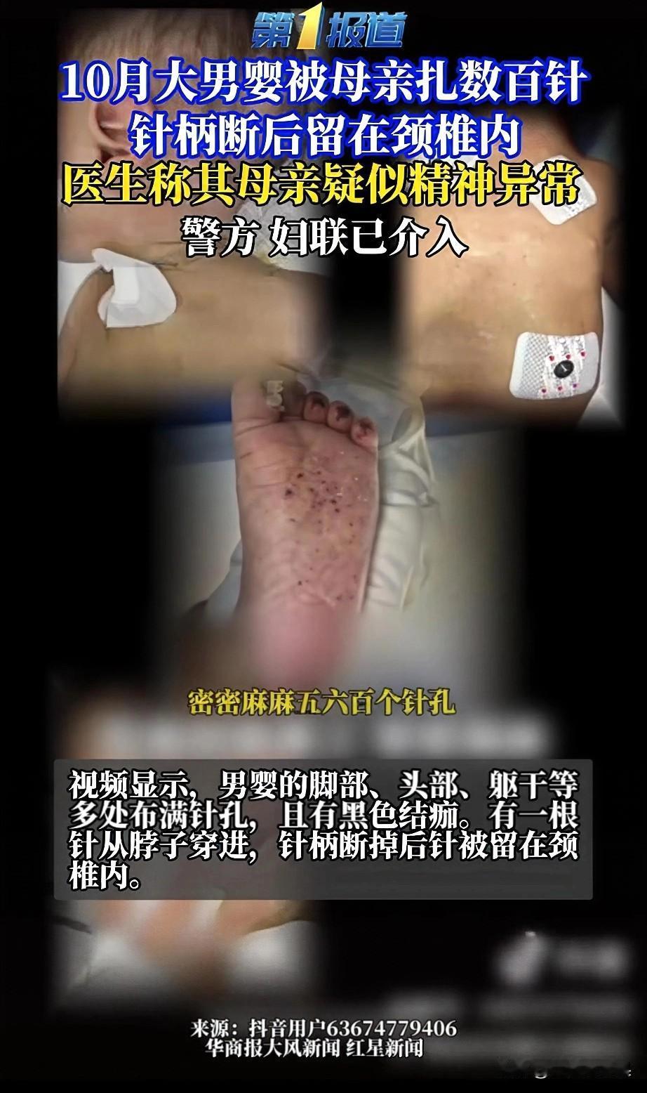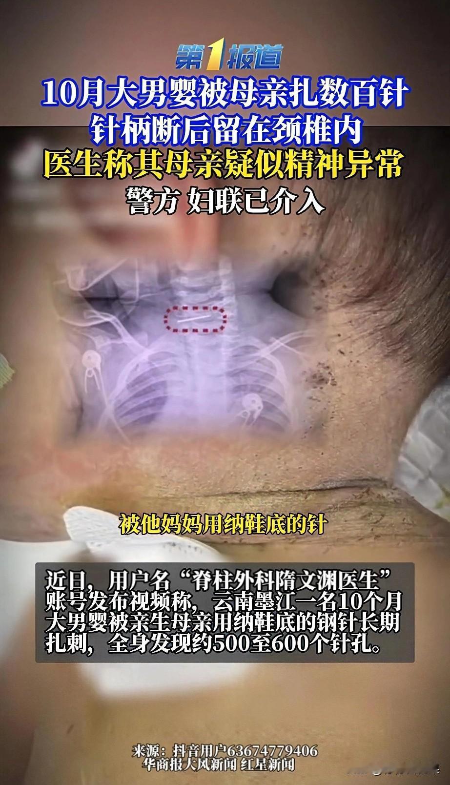 他才10个月,却被亲妈扎了五六百针! 云南墨江一个才10个月大的男婴,被亲生母亲用纳鞋底的钢针,在身上扎出了五六百个针孔,甚至有一根针直接扎穿颈椎,针柄断在了脊髓里! 你们看这照片!孩子的脚底板、后背、脖子全是针孔,密密麻麻得像个筛子!更狠的是,一根针直接扎穿了他的颈椎,针柄都断在骨头里了,再晚一步孩子可能就瘫痪了! 医生紧急手术才把断针取出来,孩子刚脱离生命危险。 医生说,孩子的母亲疑似有精神疾病,只要孩子哭闹、不听话就用针扎,这不是一时冲动,是长期虐待! 目前当地警方和妇联已经介入调查,男婴的妈妈是否有精神疾病还在鉴定中。但我想说,不管什么原因,都不能成为伤害一个不会说话、不会反抗的婴儿的理由! 我们总说“为母则刚”,可在这个孩子身上,我只看到了最残忍的伤害。可怜的孩子 对于此事你们怎么看?