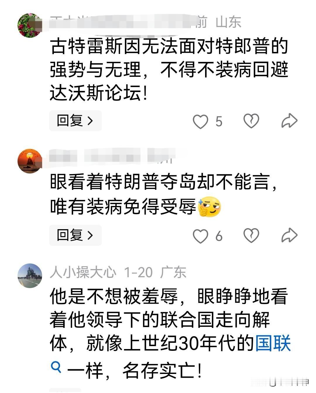 古特雷斯因病退出达沃斯论坛引猜测,真病还是另有原因? 2026年达沃斯论坛于1月19日在瑞士达沃斯开幕,奇怪的是联合国秘书长古特雷斯缺席了这次会议。 什么原因?联合国一名发言人20日表示,联合国秘书长古特雷斯因“重感冒”不得不退出达沃斯论坛。 引人注目的是,美国总统特朗普亲自率领有史以来规模最大的美国代表团前往达沃斯峰会,老特到会可能不会按规矩来,说不定把“和平委员会”、格陵兰岛问题都搬上案台,给联合国出一大堆难题,真那样古特雷特回应不回应可谓进退两难。 所以,有不少网友猜测,古特雷特缺席不一定真的有病,遇上特朗普难缠的主,很可能三十六计躲为上计,惹不起躲开才是最好的应对方法。大家觉得网友的猜测靠谱吗?我个人觉得可能性很大,因为特朗普对联合国的态度人所共知,不少场合弄得秘书长下不了台。