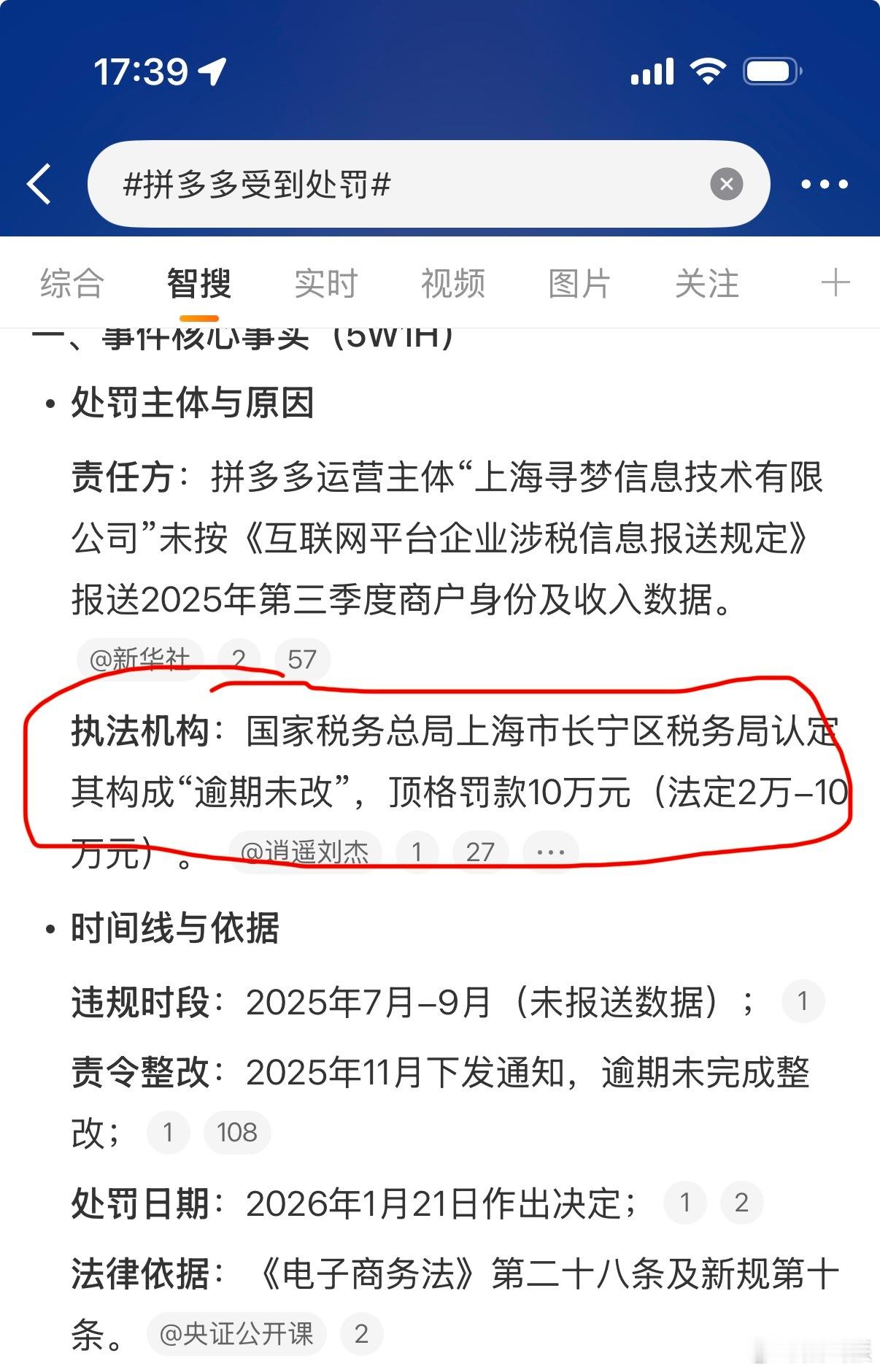 拼多多未按照要求报送2025年第三季度平台内经营者和从业人员涉税信息,被罚10万元。虽然罚的不多,但已经是顶格处罚了。拼多多受到处罚