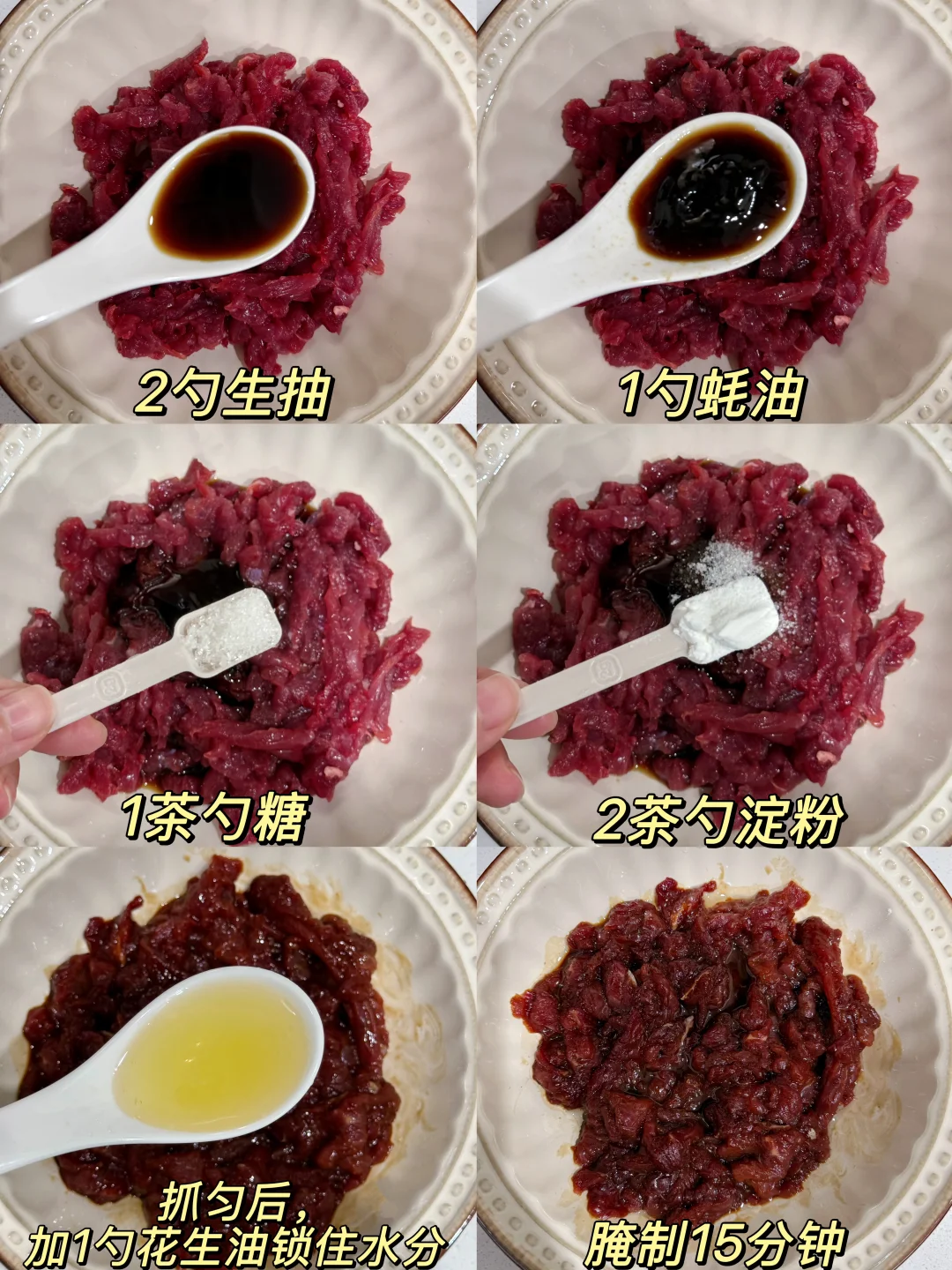 💡Tips:牛肉腌制时加油能锁住水分,油温够高再倒牛肉,一定不能炒久了,80岁都能嚼得动