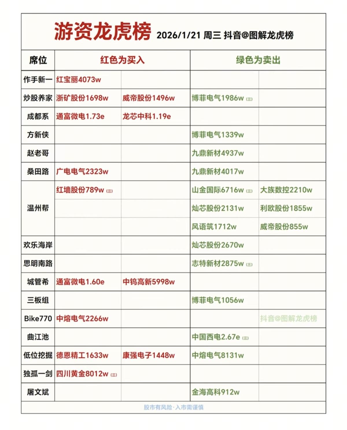 1.21周三 知名游资 龙虎榜 动态! 章盟主 入 康欣新材 九鼎新材 低位挖掘 入 德恩精工 康强电子 成都系 入 通富微电 龙芯中科 康欣新材,通富微电,获得多家游资共同抢筹。 游资票换手率高,成交活跃,股性好。