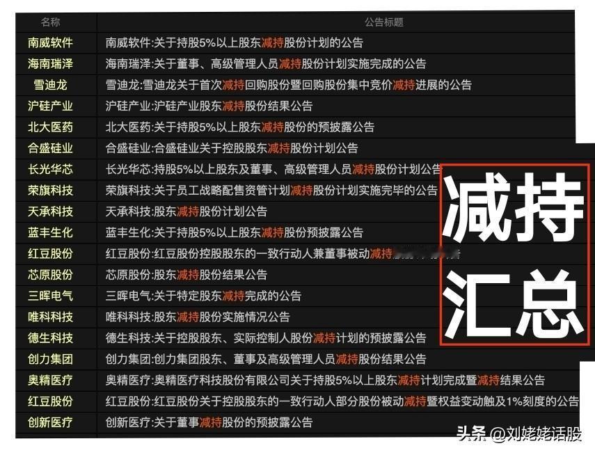 【减持公告汇总】近日发减持公告的公司不少,尽量不要踩“减持雷”…… 关注“刘姥姥”,精彩分享真不少(麻烦亲们:点赞,收藏,分享)。 特别提醒:本文涉及内容及个股,仅供交流与参考,不是荐股,不得以此作为买卖依据,盈亏自负。大股东减持 股东减持 高位股减持 公司高管减持 公司实控人减持