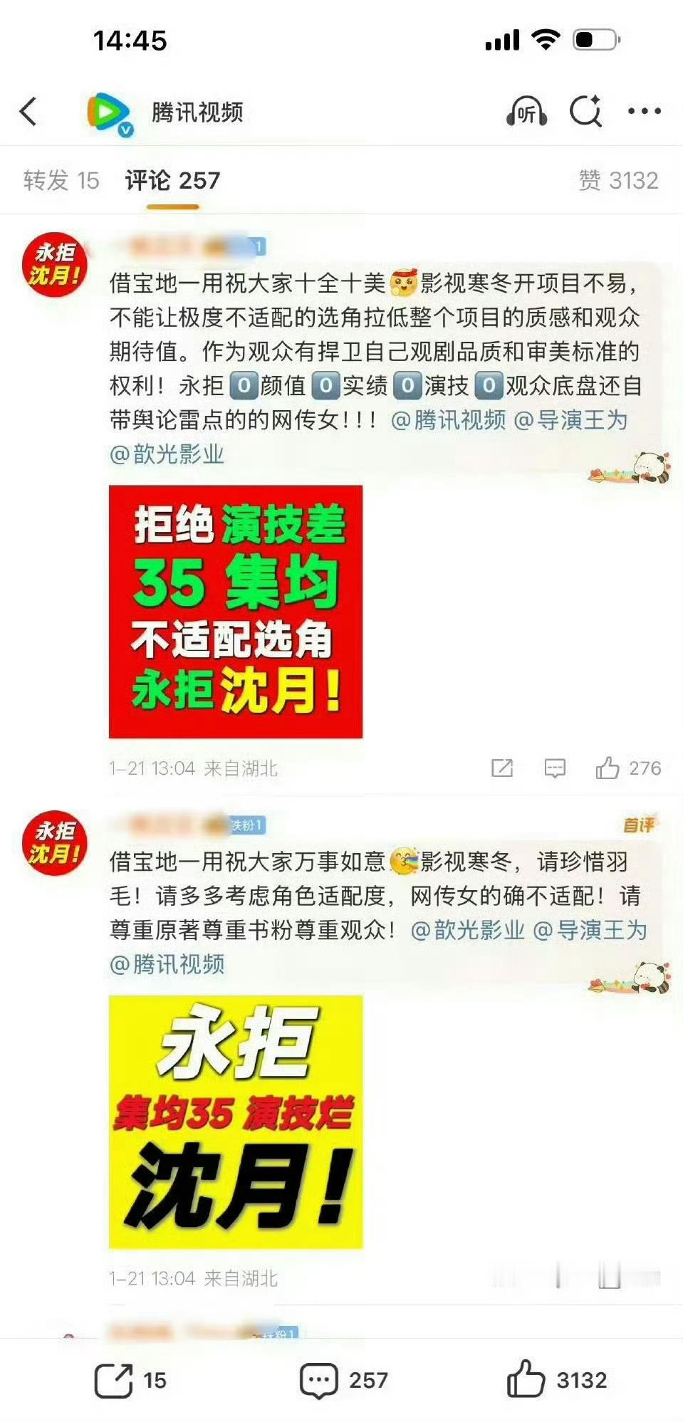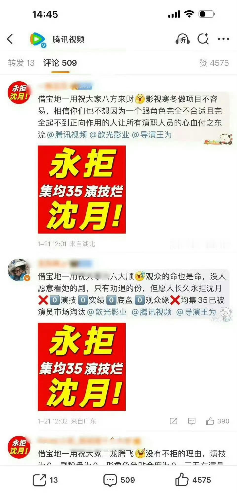 张晚意粉丝带着“永拒沈月”,冲到腾讯官博下了