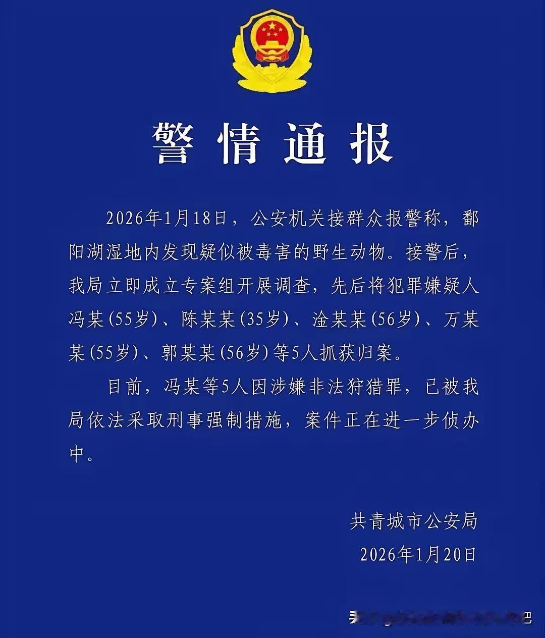 鄱阳湖投毒的抓到了,百余只国家保护动物被毒害,5人被捕,四个人都是55岁左右,那个35岁的陈某某也跟着做违法的事,属实有点想不明白,怎么说也是一个90后,至少读过书,平时也没少刷手机,怎么会想出毒害国家保护动物的事,真的是大错特错。 有网友表示:这样的犯罪就应该重重的判决。10年左右。让附近的村民都害怕。让他为自己的责任担当。让他在后悔中度过余生。作为政府人员绝对不能再不管这种犯法的行为了。国有国法家有家规。 我早几天刚去鄱阳湖看过鸟,从下午堵车堵到晚上,当地人应该看到的,应该懂是因为它们珍稀难得见,明知故犯敢下手,必须严惩。 公安机关应加大查出以及打击的力度,只有让犯罪的成本变高,付出的代价变大,才能起到震慑作用。面对毒鸟行为依法严厉追责,绝不姑息,官方用实际行动捍卫了鄱阳湖湿地的生态安全。 从快从重惩处,并在鄱阳湖周边加大力度持久宣传投毒后果,加强震慑力,游街示众也不为过,否则还会有类似情况出现,敢以身试法者大有人在且层出不穷。 对此大家怎么看呢