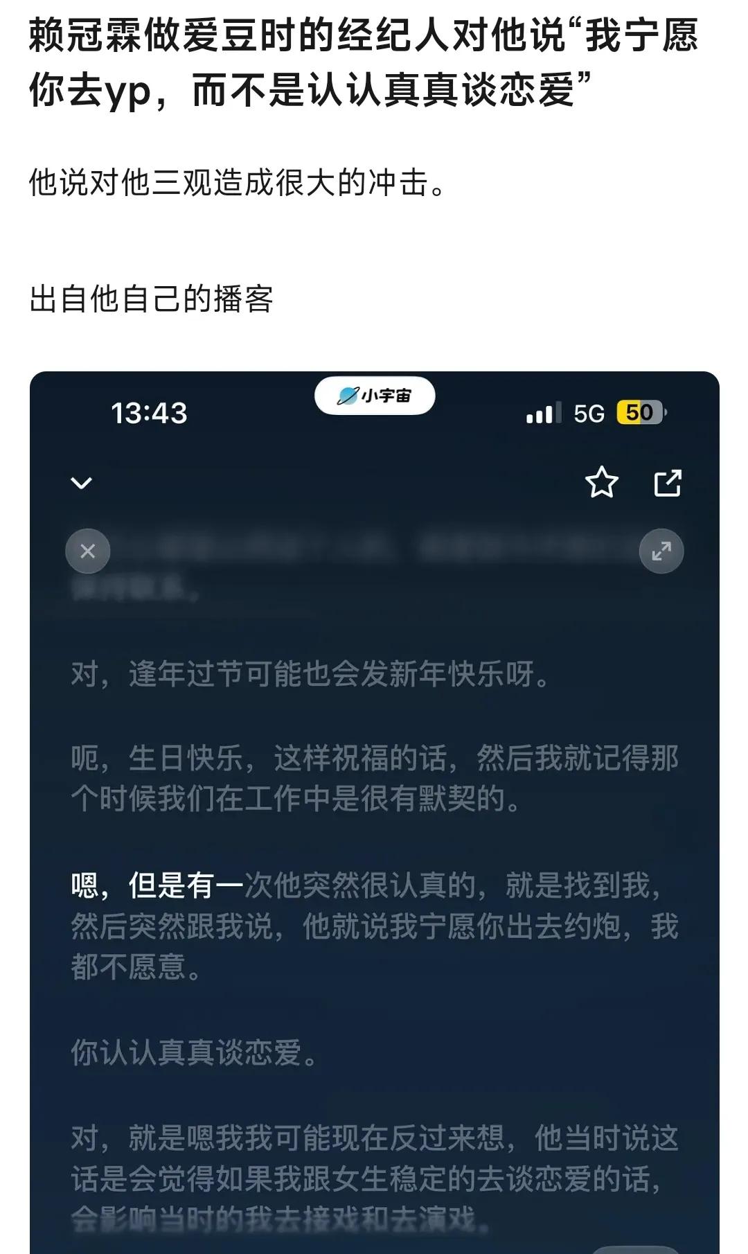 赖冠霖经纪人曾对他说:“我宁愿你出去约,都不愿意你认认真真谈恋爱。” 要知道两人当年在工作中默契相当,逢年过节还会互发祝福,谁能想到经纪人会抛出如此颠覆认知的言论,这句话对当时的赖冠霖造成了很大的冲击。 在经纪人看来,和女生稳定谈恋爱,会影响男演员接戏和演戏。但赖冠霖没被这套畸形规则带偏,就算被经纪人“管控”恋爱,也始终相信“认真对待感情不是错”。 认识他是在韩团选秀,作为wannaone里唯一的中国人,曾经非常非常火。再次见到他是发退圈声明,三观正的人可能真的不适合这个圈子。 我觉得赖冠霖是一个很爱思考的人,他对自己的人生有自己的见解,并且他喜欢感受生活,喜欢落地大于云端。因为不想被定义,被贴上各种标签,所以他“跳出系统”,不再做别人的提线木偶! 真的好有勇气,并且成长得飞快,现在的他剪着寸头搞创作,不用再应付爱豆的各种离谱要求。也许没有偶像时期年轻精致,但内在提升,气质更成熟。他的决定也是出于对自己的考虑和对未来的规划,选择另一个赛道重新奋斗,或许会更自由吧。