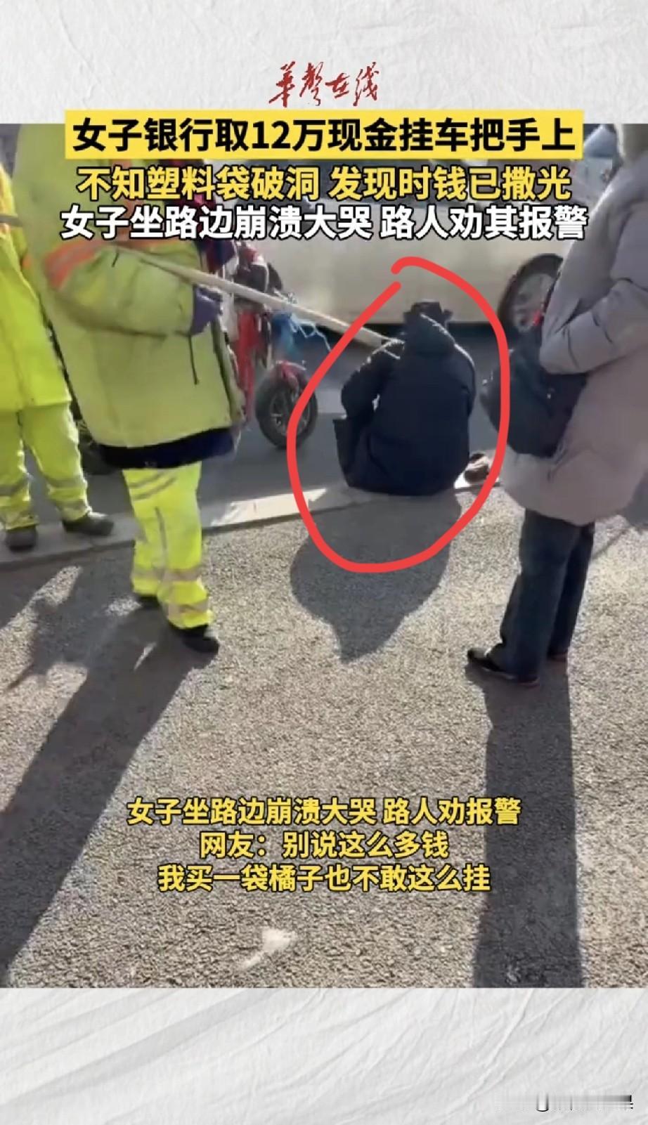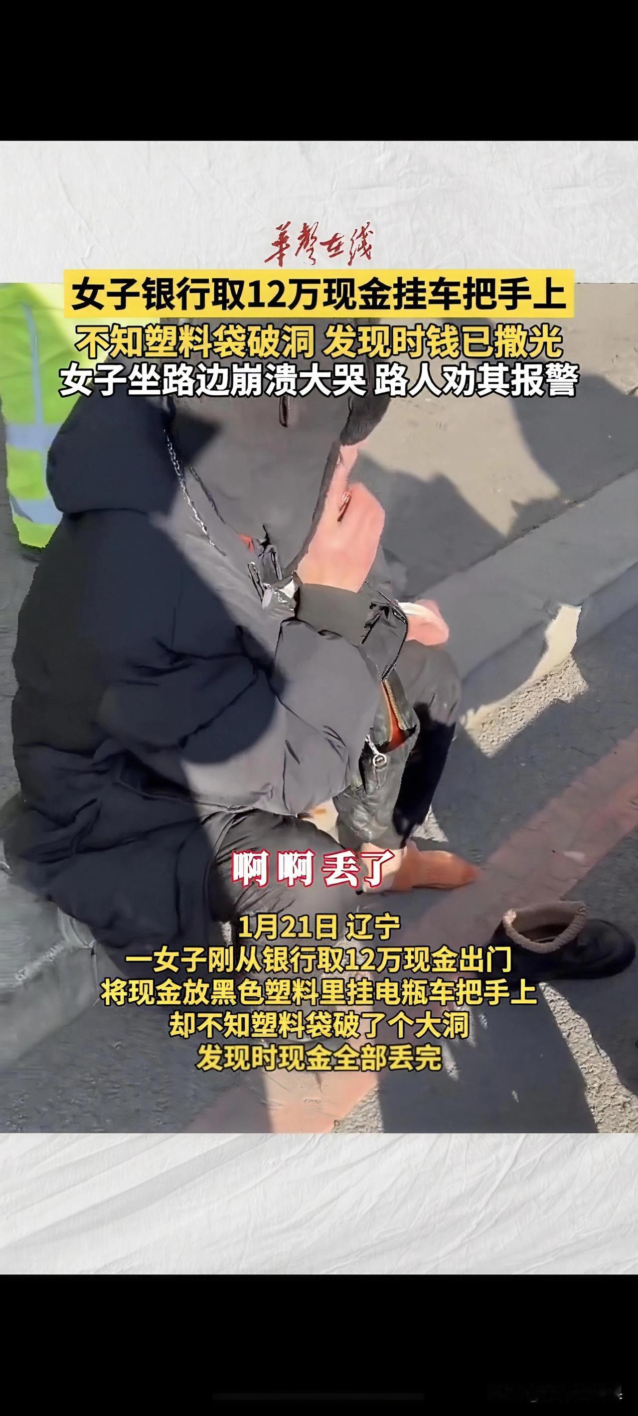 辽宁这位大姐的遭遇,看得我心都揪成一团了! 刚从银行取的12万现金,就用个薄得像纸的黑塑料袋装着,随手往电瓶车把手上一挂。结果路上一颠,袋子磨破个大洞,钱就这么哗哗哗一路撒了出去! 等她发现时,马路上连一张钞票影子都没了!她直接蹲在路边崩溃大哭,一边哭一边喊“钱没了!全没了!”,路过的人都看傻了,赶紧劝她报警。 12万啊!那可是普通人好几年的工资,可能是给孩子准备的学费,也可能是家里的救命钱,就因为这一秒的疏忽,说没就没了! 这事儿也给咱们所有人提了个大醒啊!大额现金真的不能这么马虎!要么用个结实的包贴身揣着,要么直接手机转账多省心,千万别让自己的血汗钱,就因为一个破塑料袋全打了水漂! 你们有没有过因为一时疏忽丢了贵重东西的经历?评论区聊聊,给大家提个醒!