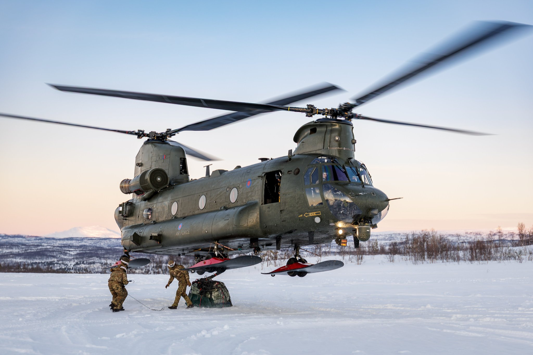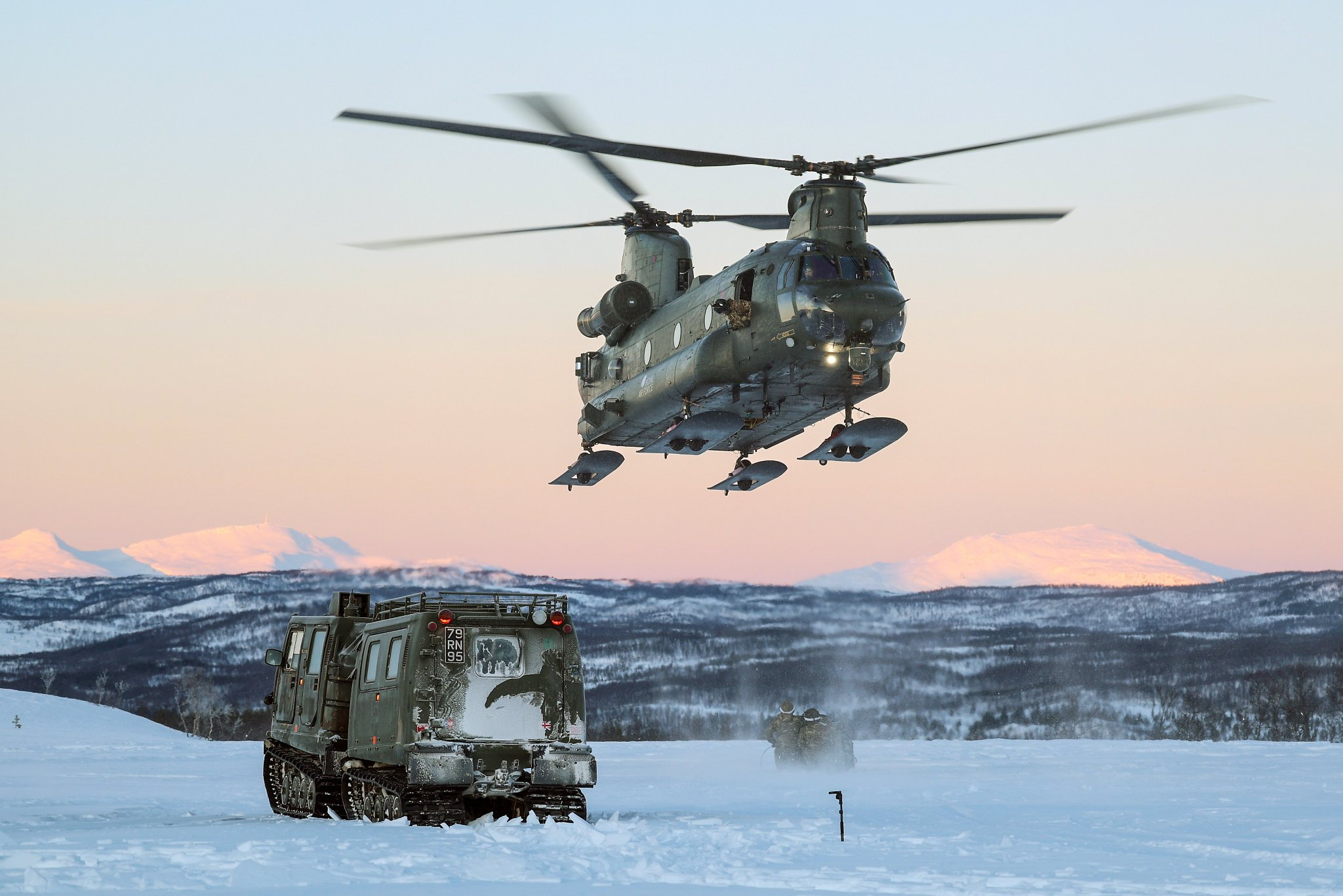 在挪威耀武扬威,却不去保卫格陵兰?来自英国皇家空军奥迪汉姆基地的支奴干直升机已抵达挪威,加入“发条行动”。他们的行动基地位于北极圈内的巴杜福斯,这些CH-47专门为极地环境设计,起落架带有雪橇,和全地形车配合。多年来,英国皇家空军其实定期在挪威进行极地环境训练,“鹞”式垂直起降战斗机甚至涂有专门的极地涂装。烽火问鼎计划