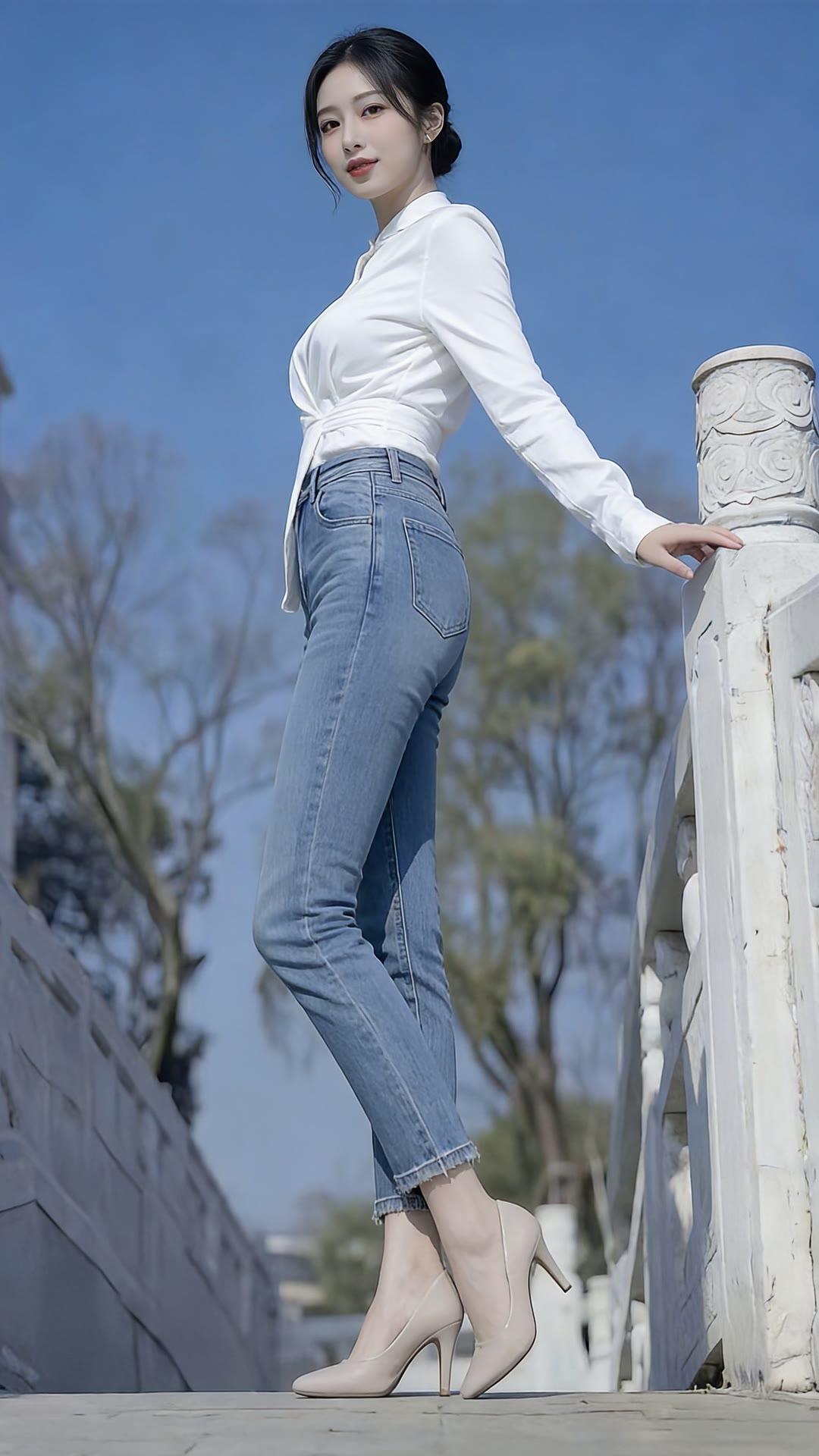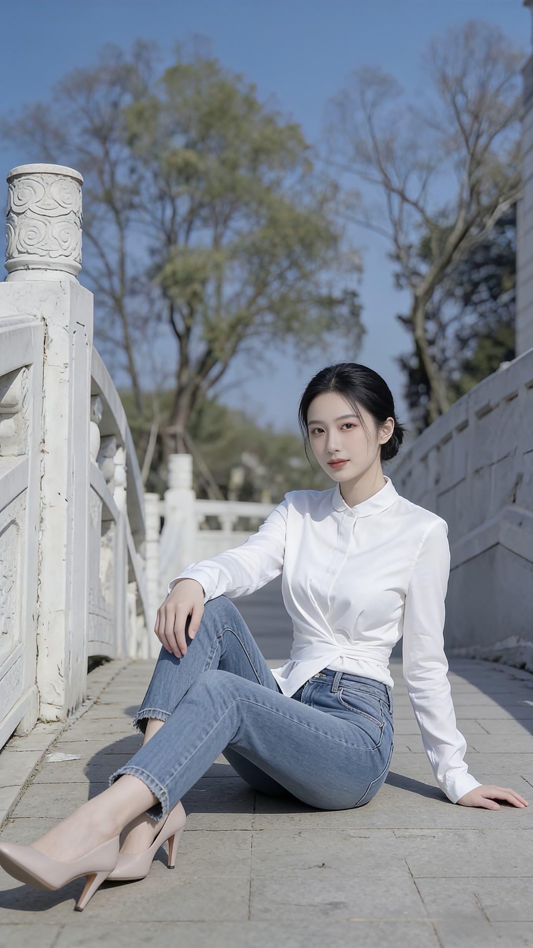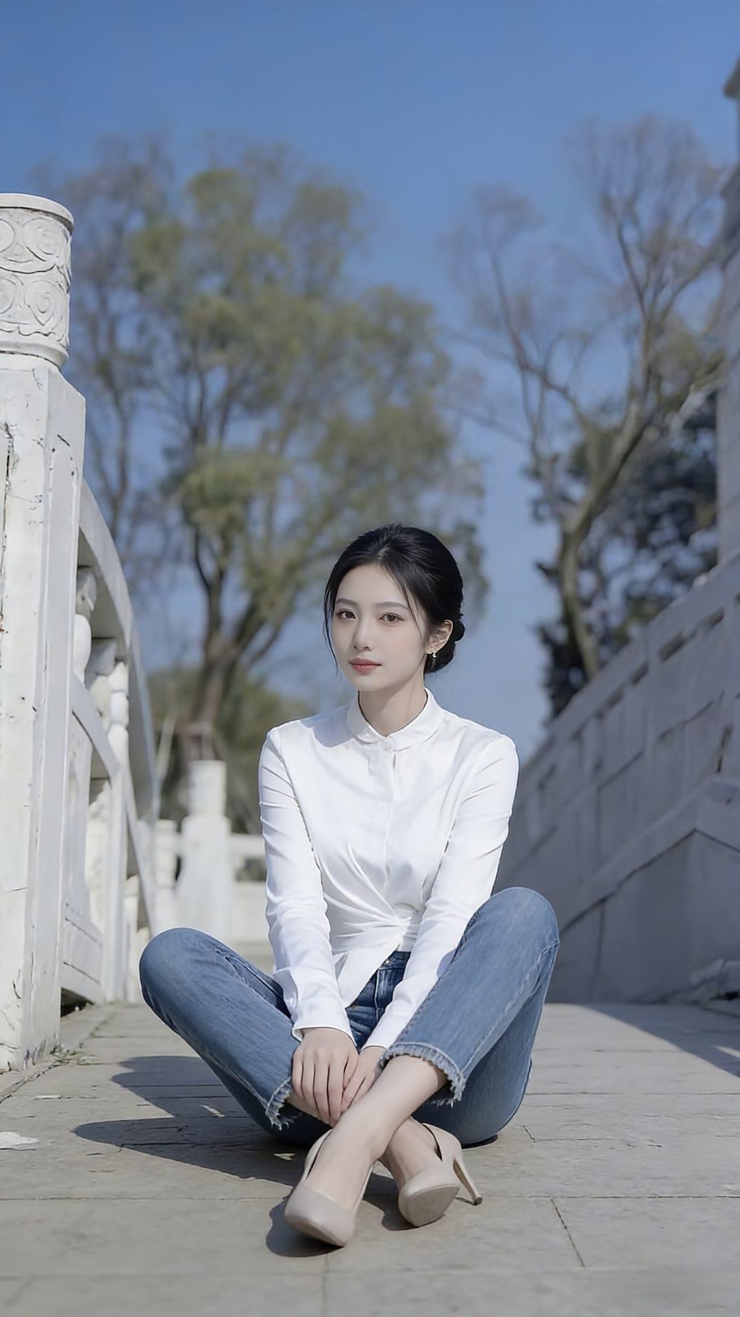 清新白衬衫搭配牛仔裤,优雅气质,阳光明媚的一天。