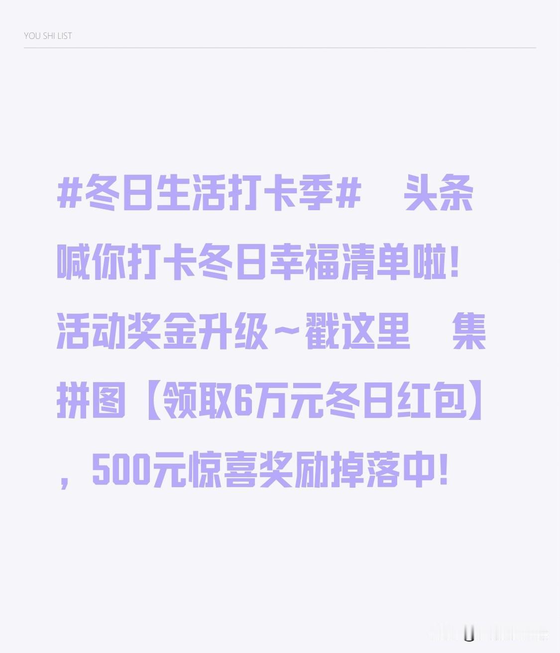 冬天真的太有魅力啦!对小朋友来说,是期待堆雪人的季节;对大人而言,是旧年结束、新年开启的时节。雪一下,到处都热热闹闹的,一家人也更容易聚在一起。 现在头条的「冬日生活打卡季」活动奖金升级了,集拼图能领6万元冬日红包,还有500元惊喜奖励呢!好多人不知道咋参加,在今日头条APP里,点“我的-创作首页-发布-创作活动”就能找到。不过参加时得看清要求,比如带特定话题、发够篇数、达到阅读量啥的。我上次就拿到了1.4元活动奖金,说不定比创作收益还多,大家赶紧冲!