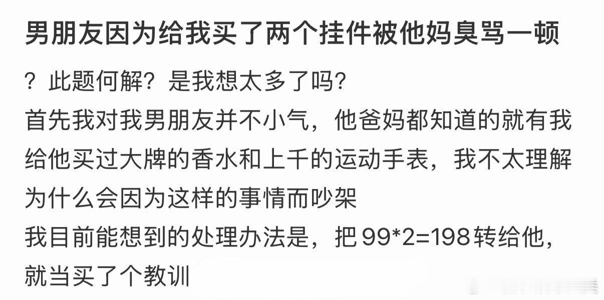 你竟然考虑的是转钱不是分手?什么事登“婆婆”啊,小两口的事老登少掺和,你情我愿小情绪,心疼你儿子那就别放出去,人家女孩也挺大方的送礼物,又不是捞女,买个玩偶有什么叨逼叨的。这男孩也是傻了吧唧,有什么可告诉家长的,除了增加负面印象,自己甜甜蜜蜜谈恋爱不就行了,说p说,现在好了吧