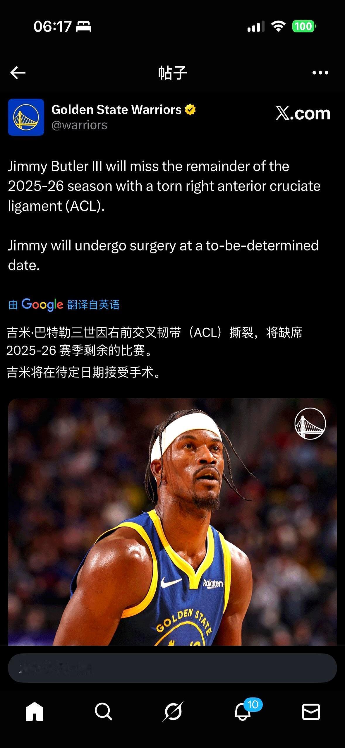 吉米·巴特勒刚把勇士拉出泥潭,右脚就踩进坑。 对热火第三节,禁区里一次普通落地,膝盖拧成麻花,ACL直接断。 当场疼得锤地板,队友架出去,MRI一出:赛季报销,手术排队。 勇士刚打出12胜4负的小高潮,25胜19负爬到西部第八,他场均20分,第二火力点。 现在人没了,冠军窗口啪一声关条缝,库里又老一岁,谁替他扛球权? 管理层放话:不甩卖,5680万到期合同也不换筹码,先养人。 潜台词:明年能回来再说,今年拼到哪算哪。 巴特勒倒乐观,社媒自嘲“general soreness”,可谁都知道,这伤一年起步。 勇士球迷刚点燃的火,被一盆冰水浇灭。 季后赛?先保住席位再说吧。