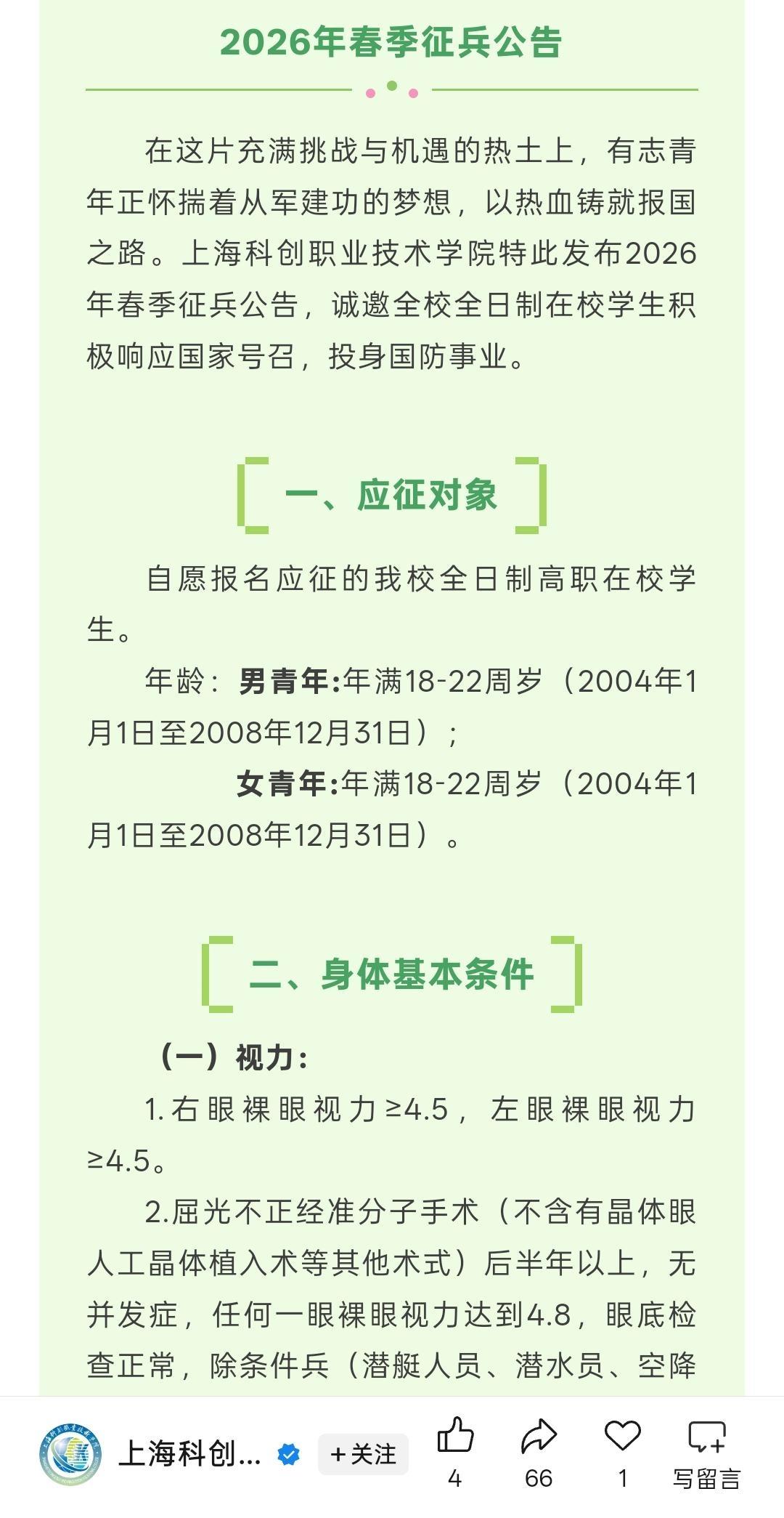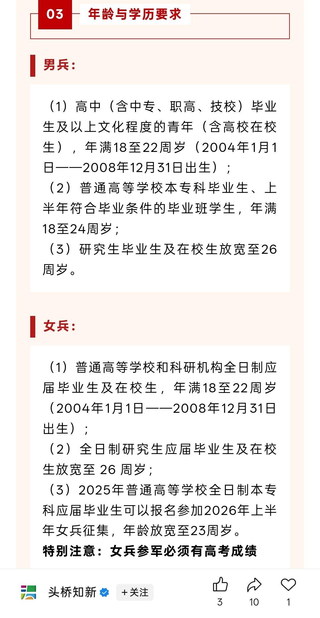 为什么上海征兵,不让男大学在校生报名了?而女生报名必须要有高考成绩?体现了军队征兵的一种什么倾向? 如图,2025年底发布的,女大学在校生可以报名,男大学在校生已经不可以了,必须要毕业生才能报名。是因为男兵太多了? 订正:该通知意指征集对象为18-22岁男青年,而毕业生享有年龄优惠。 附带两高校一社区征兵通知,是非不难判断。 征兵工作严肃,误读及恶意解读,应属影响征兵的不当行为! ------------------------------------ 题目错误,有误导性,虽然在下面的描述里订正了,但建议标题也改一下。在校生男生没有年龄放宽说明男生报名人数挺多的,所以不需要放宽条件凑名额;女生要高考成绩可能是女生基本都是去技术类岗位所以要严格审核学术水平,但是本科生又不好直接判断学术水平,就只好看高考成绩了。