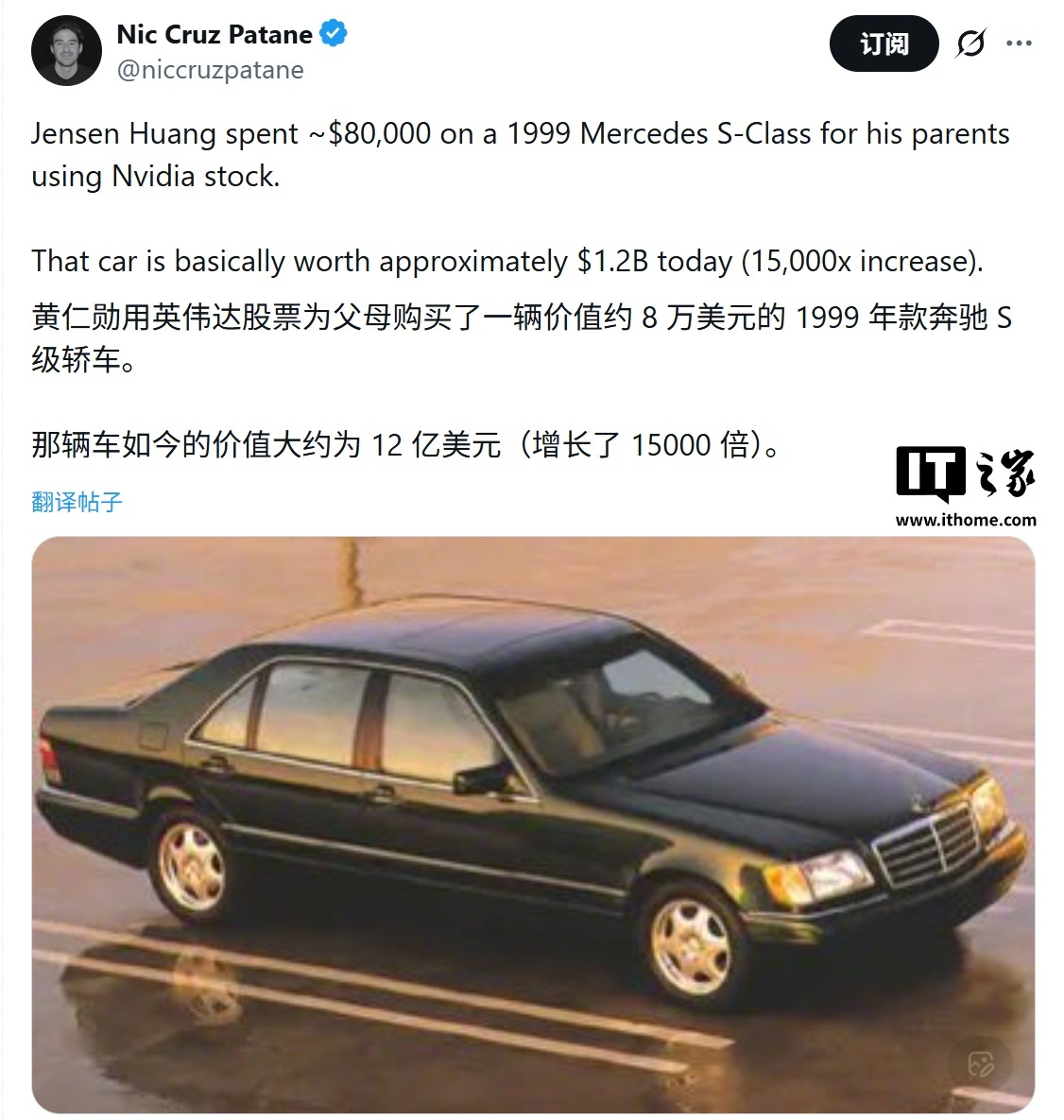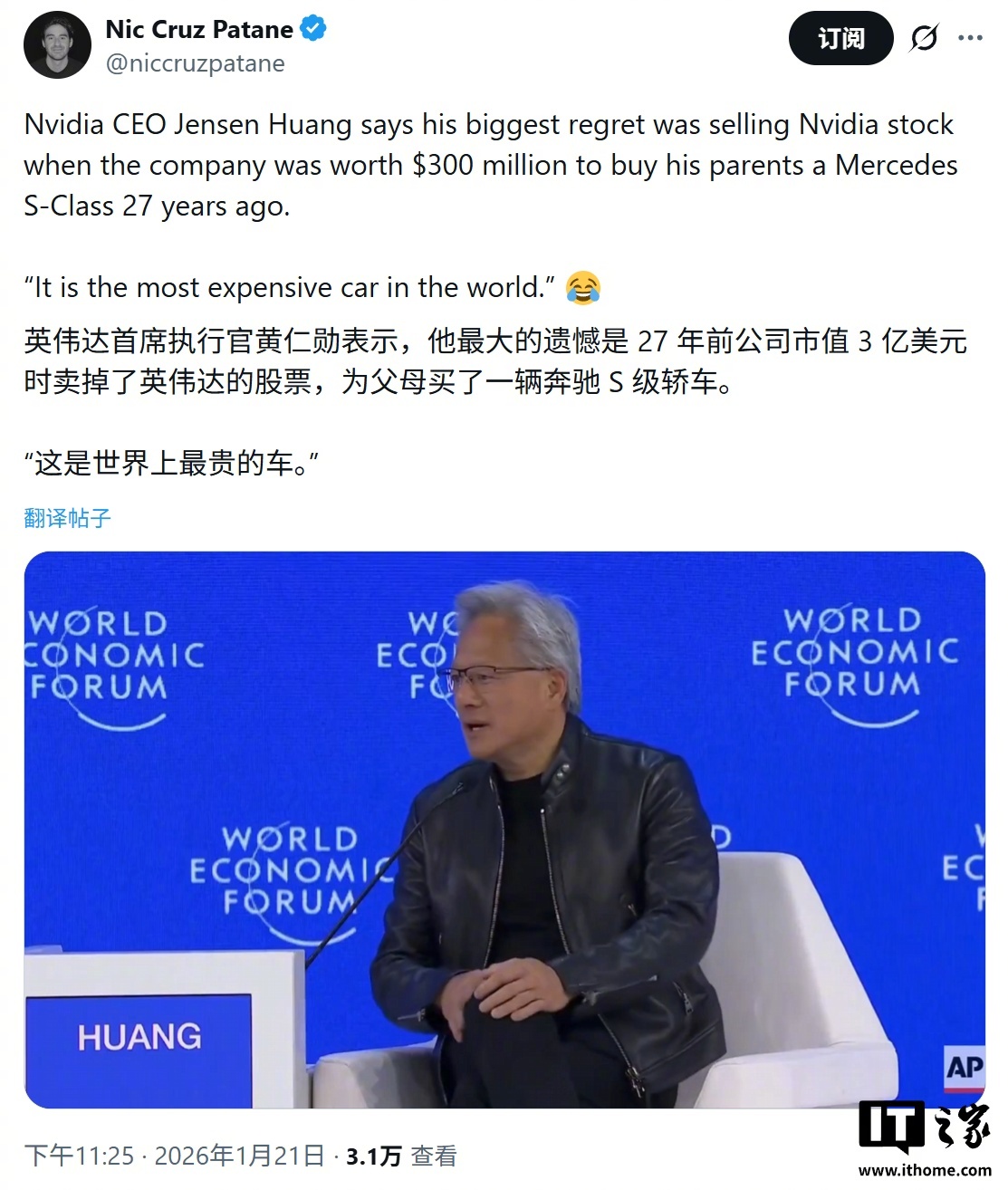 【黄仁勋称最大遗憾是 27 年前为父母买奔驰而卖英伟达股票:这是世上最贵的车】英伟达首席执行官黄仁勋透露,其公司上市后曾以 3 亿美元估值出售股票,只为给父母购买一辆梅赛德斯 S 级轿车。鉴于英伟达目前市值已逼近 5 万亿美元,他戏称这是“世界上最昂贵的汽车”。