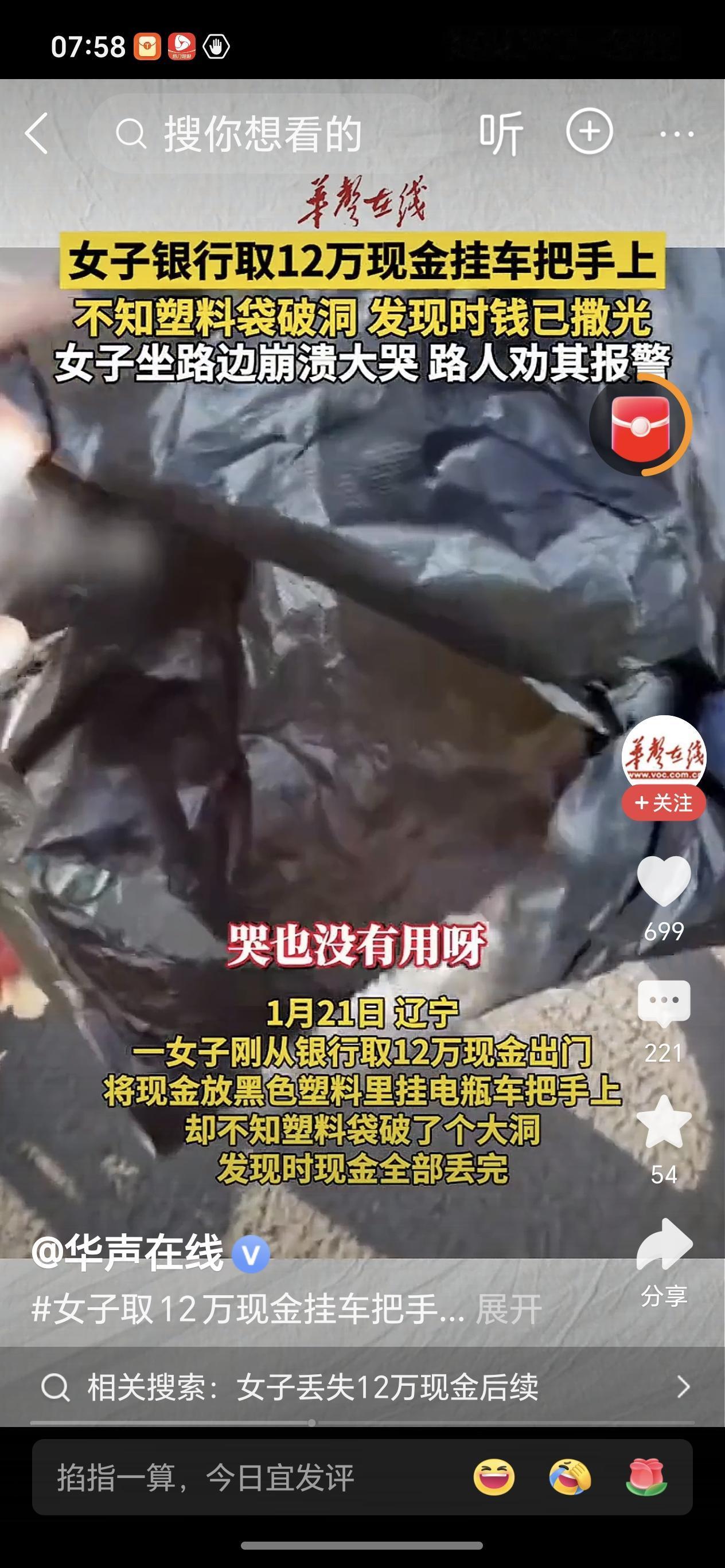 这女子心真大,用个塑料袋装那么多钱,骑车也不照看点,这么粗心大意丢了钱怨谁呢?