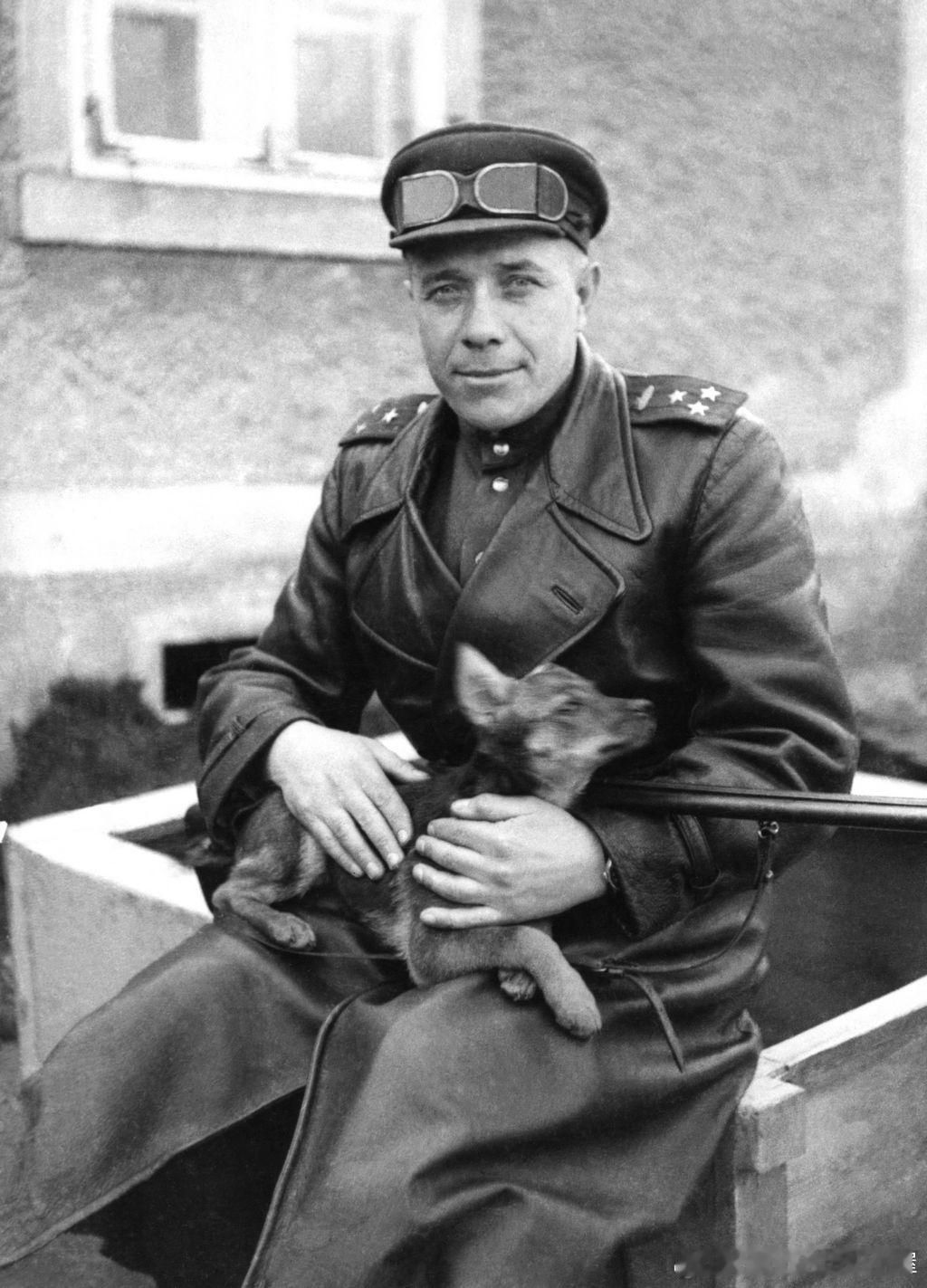 1944年近卫坦克第63旅旅长近卫上校,苏联英雄Михаил Георгиевич Фомичев福米切夫(1911.10.8-1987.11.18) 怀里抱着一只小狗。他1945年6月27日晋升装甲兵少将,1958年2月18日晋升装甲兵中将,1944年9月23日和1945年5月31日获得苏联英雄称号军事历史全触达