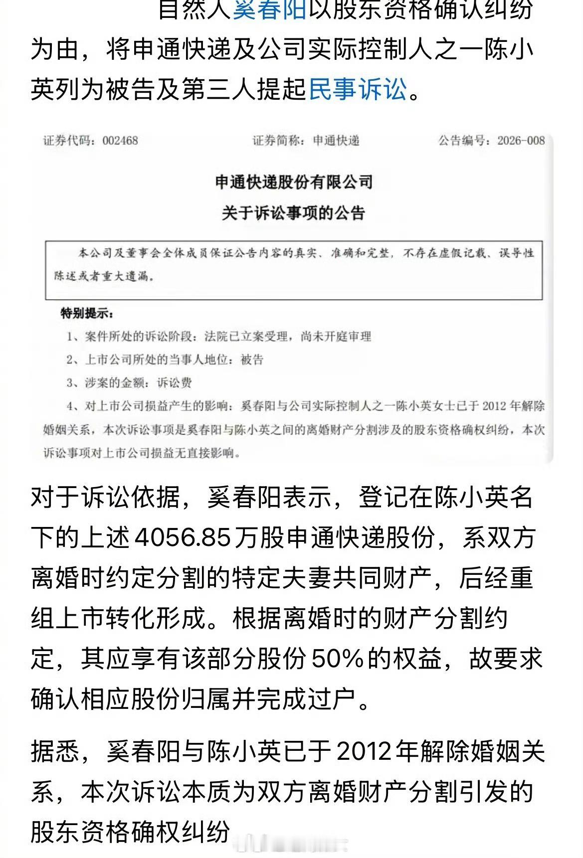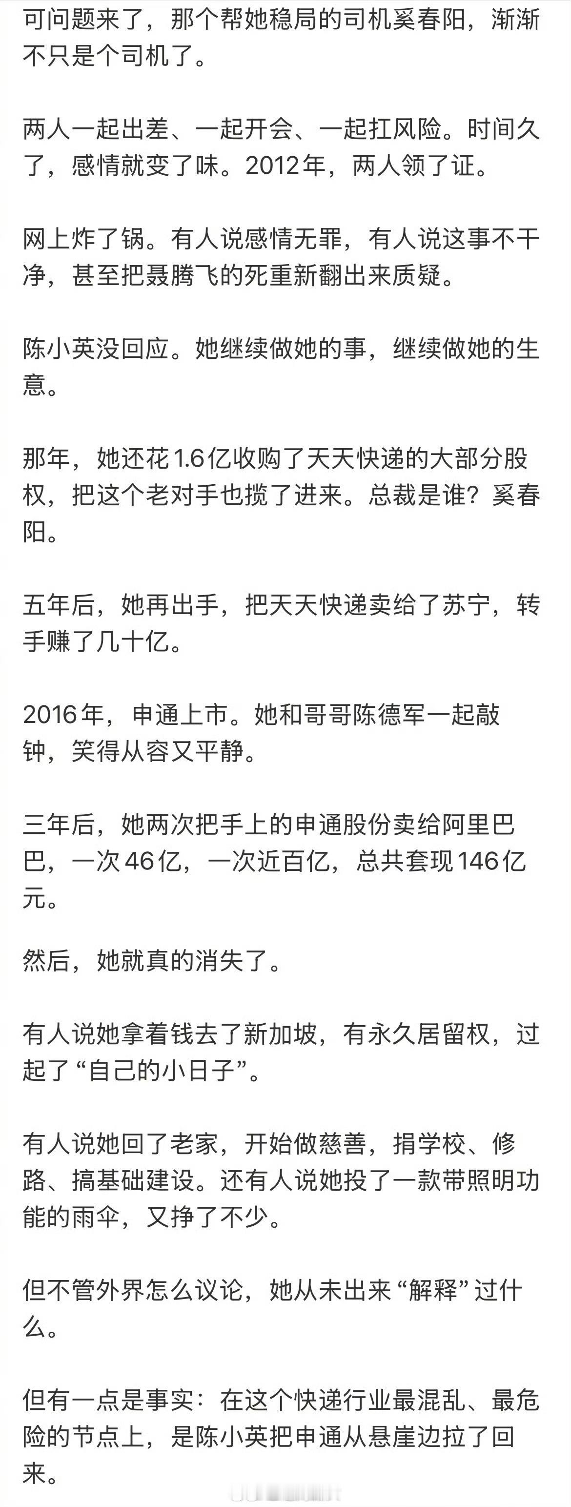 申通创始人因车祸离世,妻子改嫁司机,套现百亿离婚多年后,遭前夫奚春阳起诉:索要股