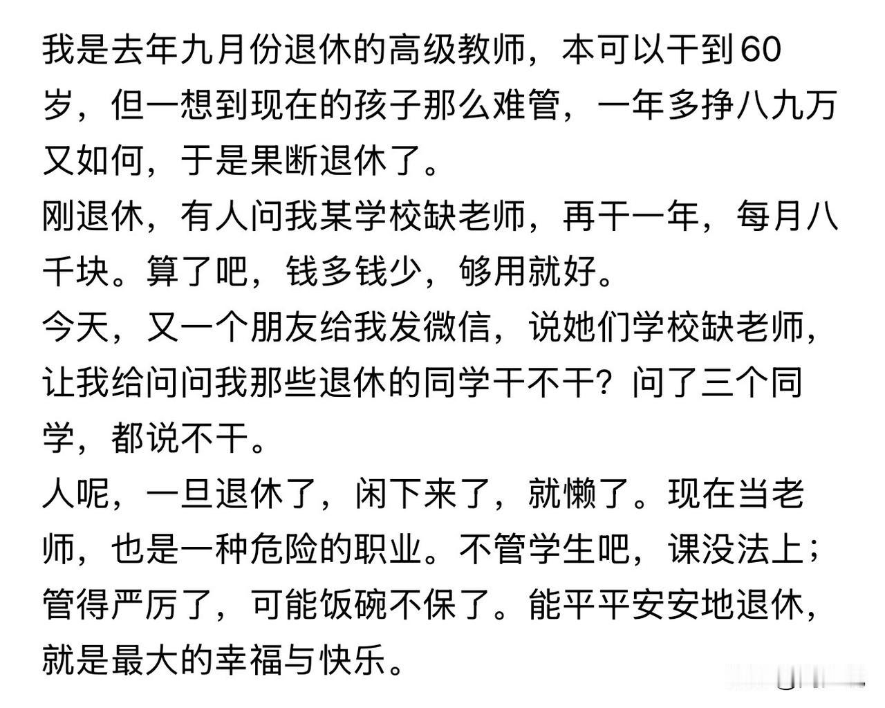 这位教师是聪明人,已经拿到高级教师职称,确实没必要那么拼了,虽然每年可以多赚八九万,但生活还有诗和远方。特别是当下,当老师确实不好当,不管学生,课没法上,管得太严厉,铁饭碗又怕不保。现在退下来,有大把时间享受退休生活,岂不乐乎?#寻美三湘# #长沙新朋友#