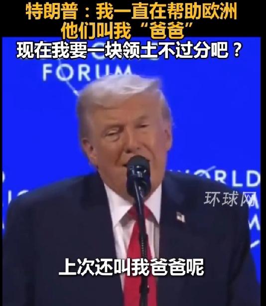 特朗普:我一直在帮助欧洲,他们叫我“爸爸”,现在我要一块领土不过分吧? 美国总统特朗普1月21日在瑞士达沃斯举行的世界经济论坛年会发表演讲时说,“我一直在帮助欧洲,他们都喜欢我,上次还叫我爸爸呢!但现在我想要的,是一块冰冷且位置偏僻的土地(格陵兰岛),相较于我们几十年来给予他们的东西,这个要求微不足道,现在我要一块领土不过分吧?” 看了特朗普的这段讲话,再一次印证了中国一句老话,叫做“毛病都是惯出来的!”至此,不由得让人想起了北约秘书长吕特,想起了欧洲国家围拢在特朗普白宫办公桌前聆听特朗普教诲的一幕幕画面。 按照老特这段话风往下思考的话,他说的好像不无道理。既然都喊人家“爸爸”了,那么“爸爸”如今要拿走“儿子”的一块冰冷的土地好像也是顺理成章的事儿。毕竟“爸爸”不是白叫的,“儿子”也不是白当的。总而言之,就是既然成为了一家子,那么就是一家人不说两家话。 看看现在这事闹的,让老特在世界面前抱怨个不停,也让世界明白了一个道理。原来那么大一个格陵兰岛在他眼里竟然是微不足道的那么一丢丢,难怪他不止一次的把眼光瞄向了他的邻居。